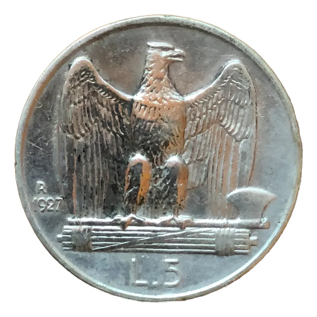 Moneda italiana 5 liras 1927-R, plata 0,835 y 5 g, Vittorio Emanuele III (KM 67.1). Conmemorativa muy apreciada por su diseño y contenido de 5 gramos de plata.​moneda de una epoca italiana lejana y un pequeño pedazo de historia de esa nacion, de un siglo de antiguedad. ideal para inversion o coleccionarla, ademas tenemos mas monedas italianas en stock,
