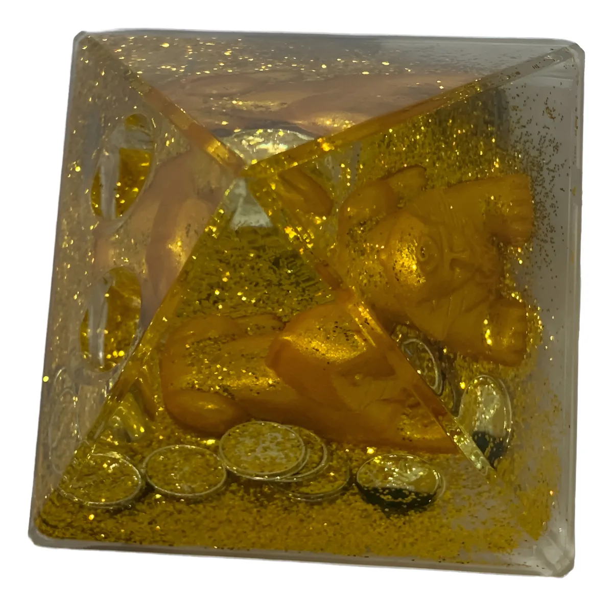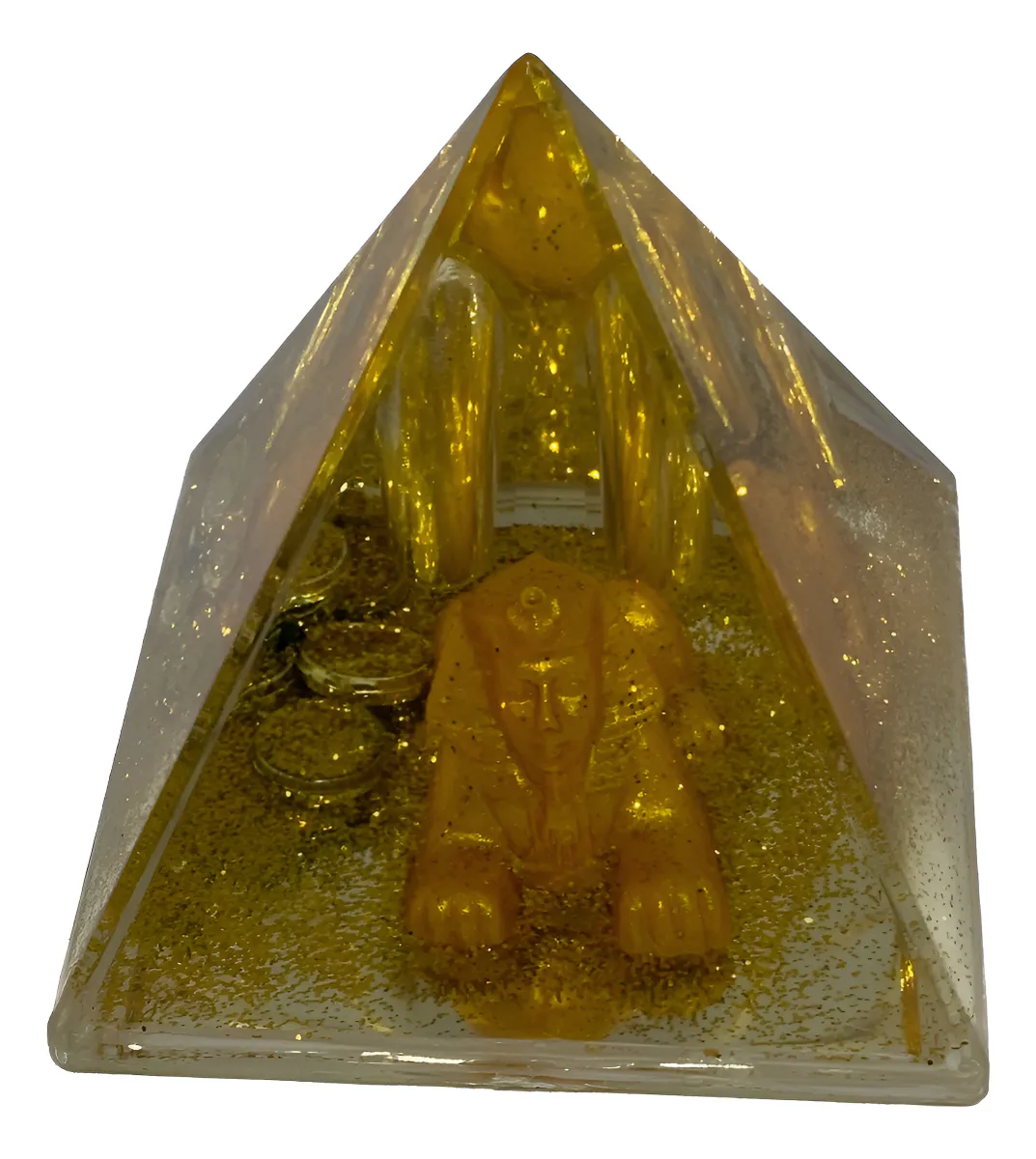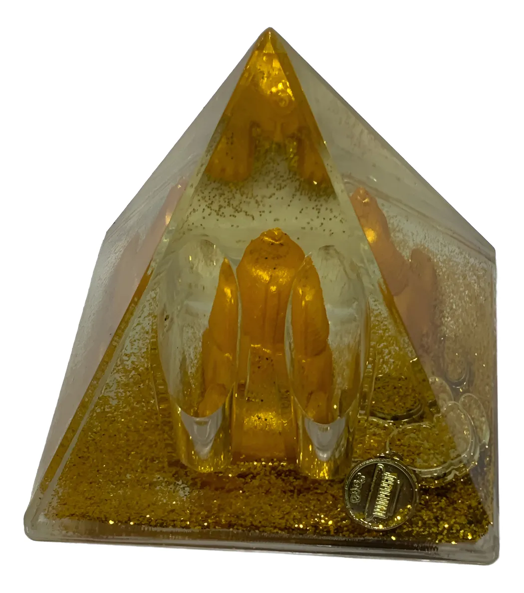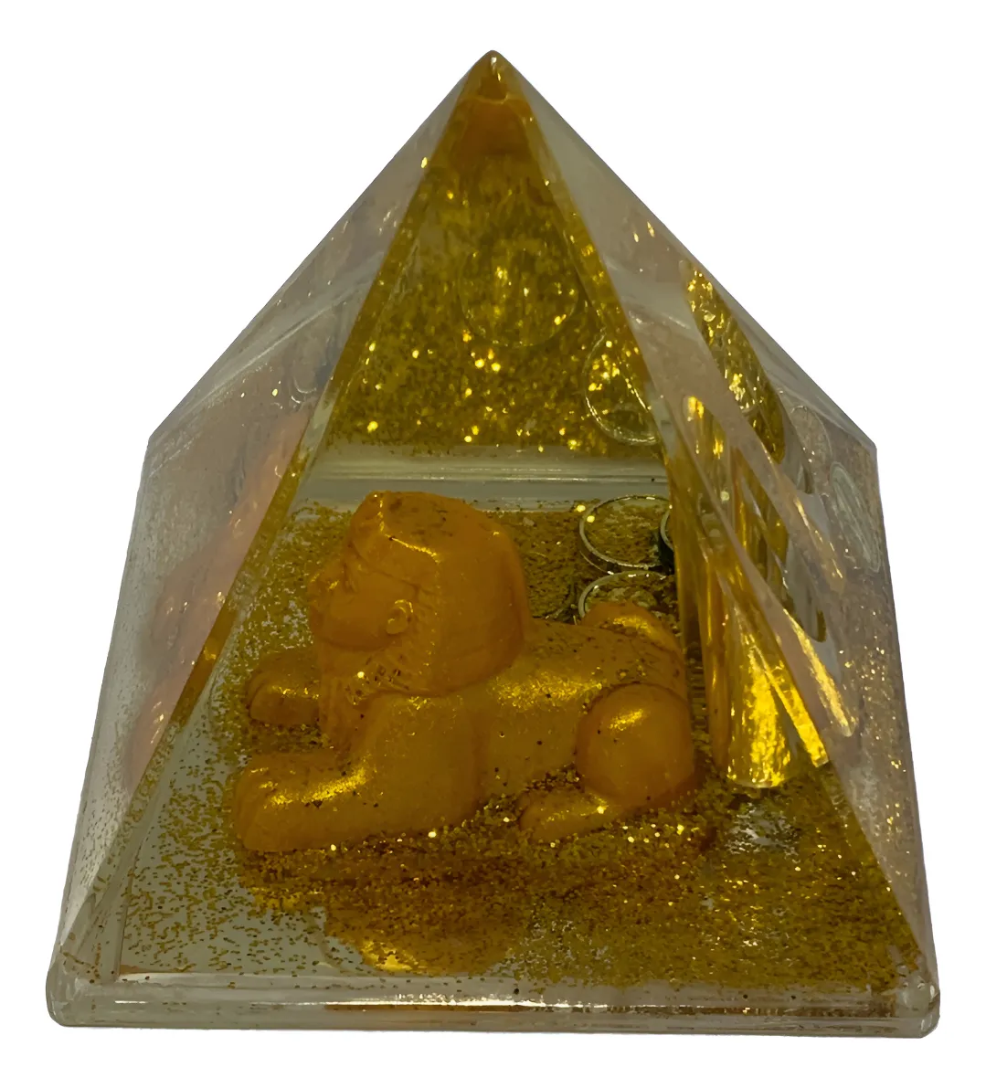 Souvenir temático que incorpora pirámide con león, monedas decorativas y polvo dorado. Fusión de elementos mÃticos egipcios atractivos para fortalecer colecciones o regalar en ocasiones especiales.