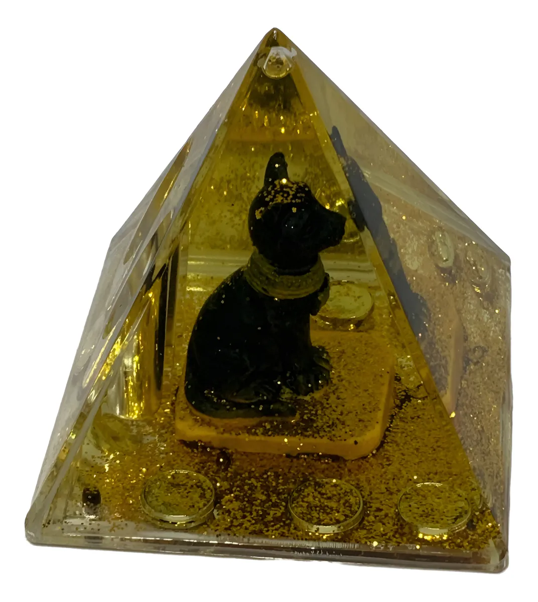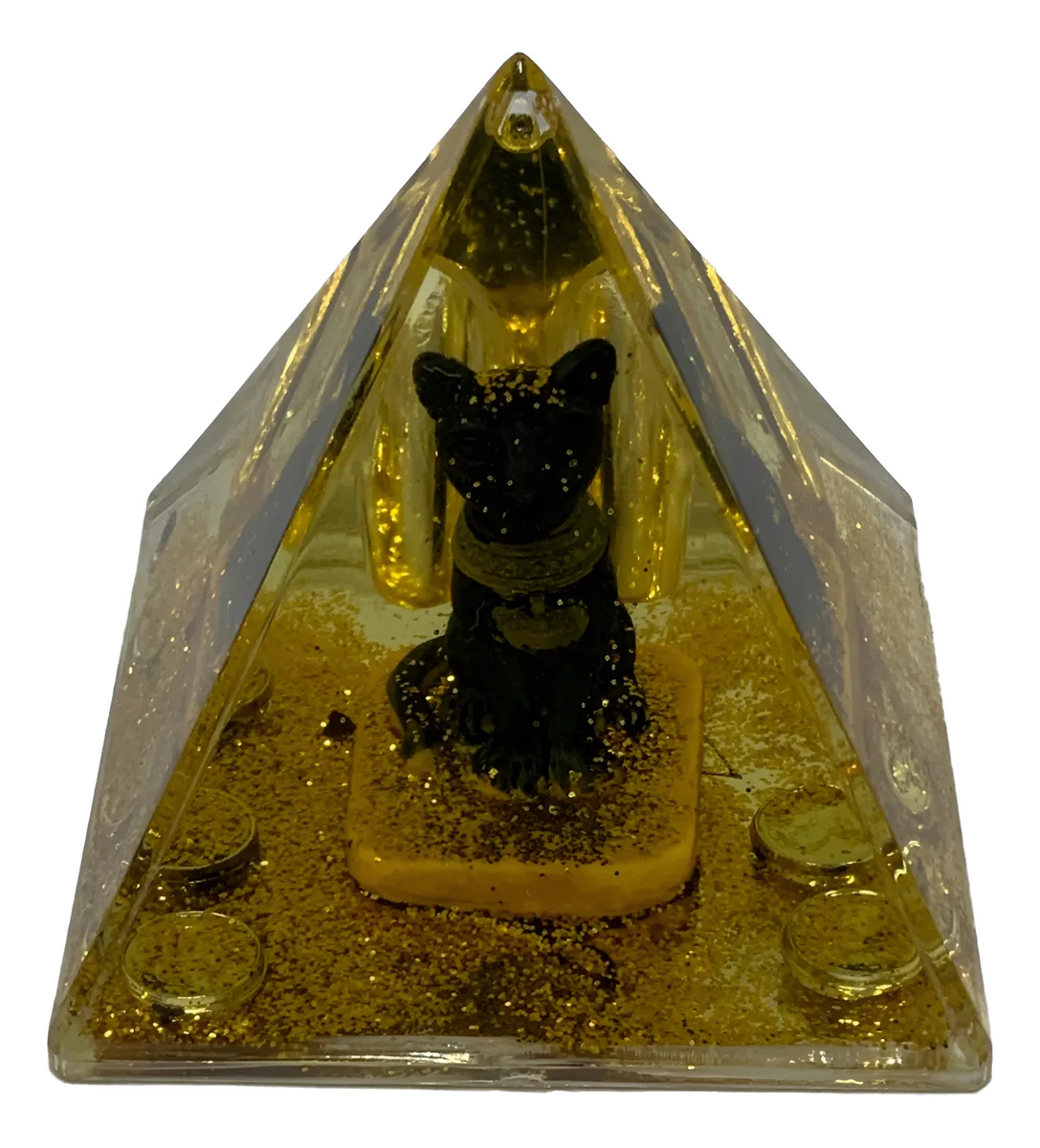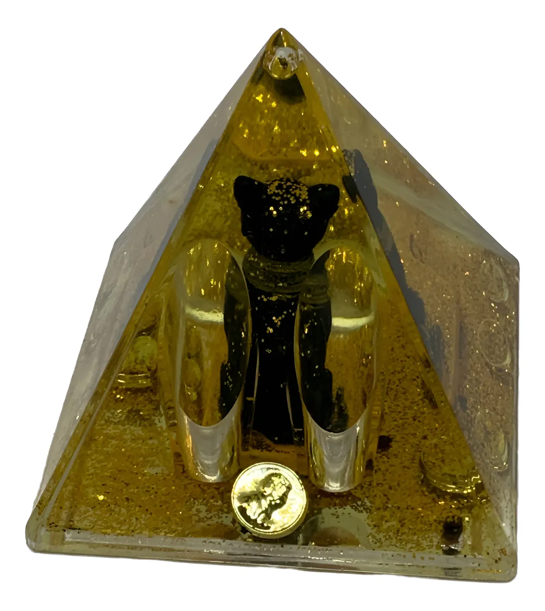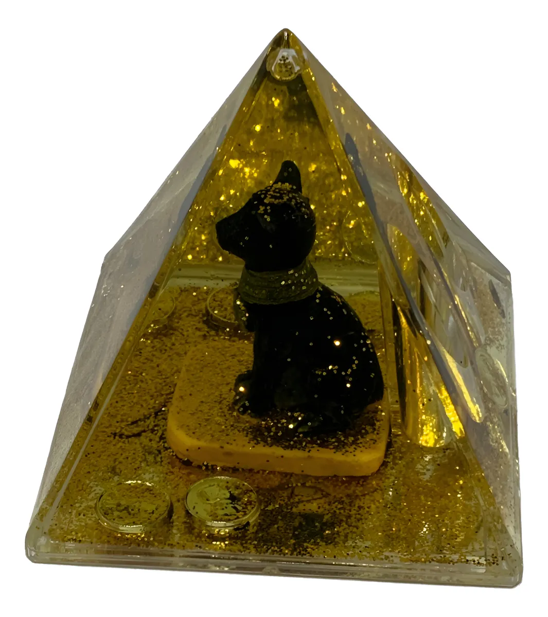 Set decorativo que incluye pirámide egipcia, figura de gato negro, monedas y polvo dorado. Representa protección y fortuna en la tradición egipcia, ideal para decoración, regalos o añadir variedad temática a una colección.