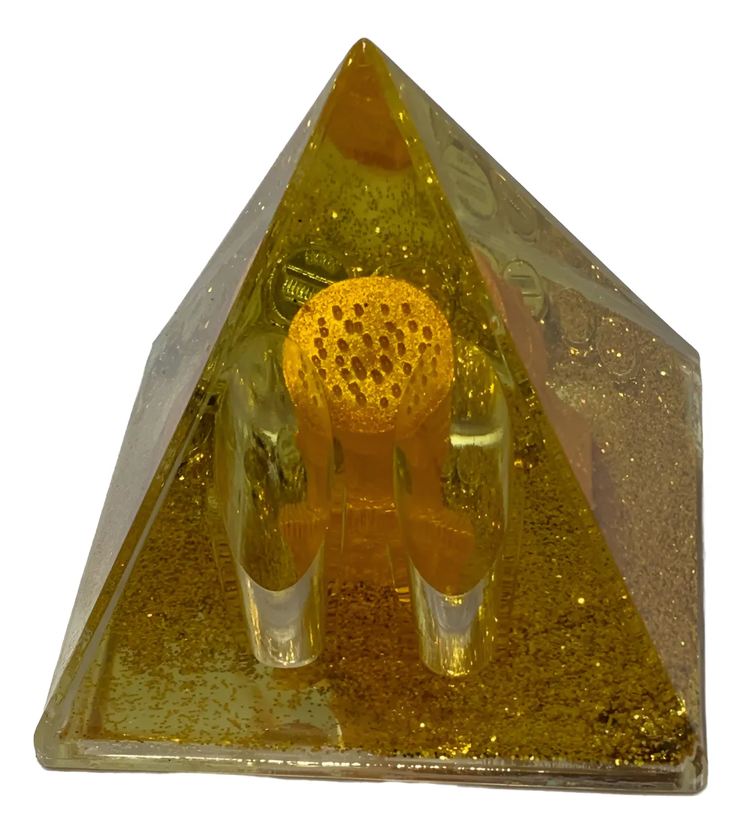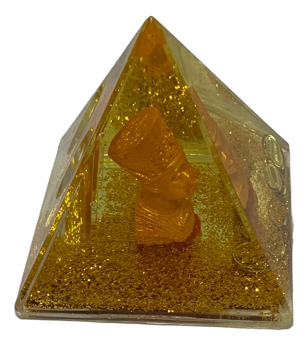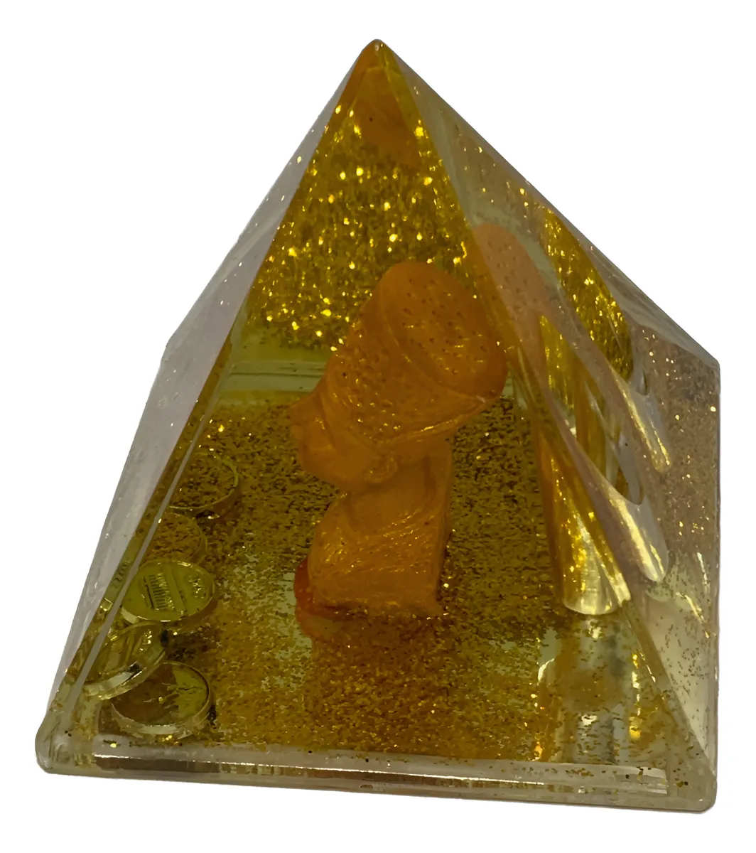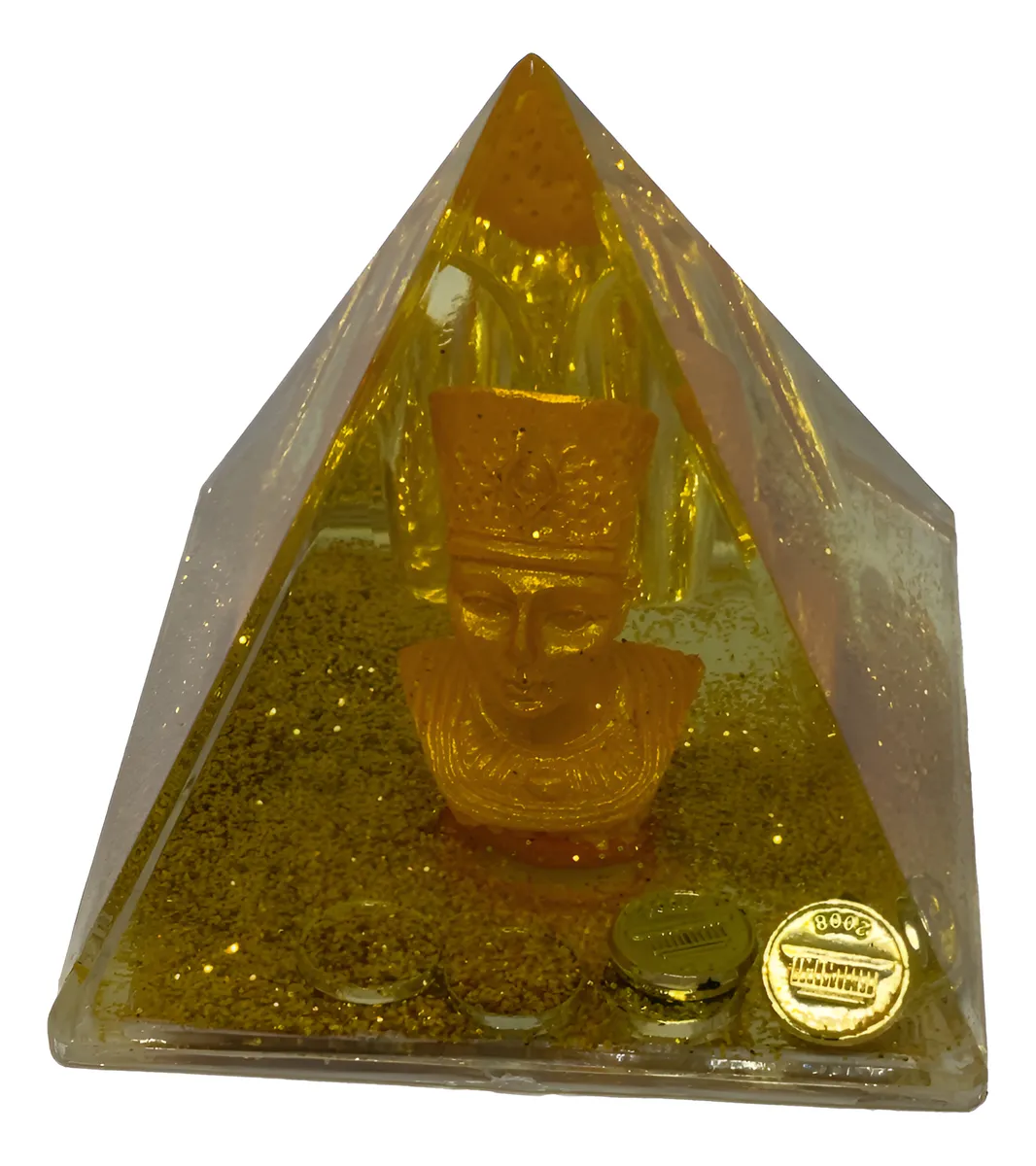 Souvenir compuesto por una pirámide egipcia que resguarda figura de Tutankamón en su interior y monedas doradas. Diseño innovador y simbólico perfecto para amantes de la historia y cultura faraónica.