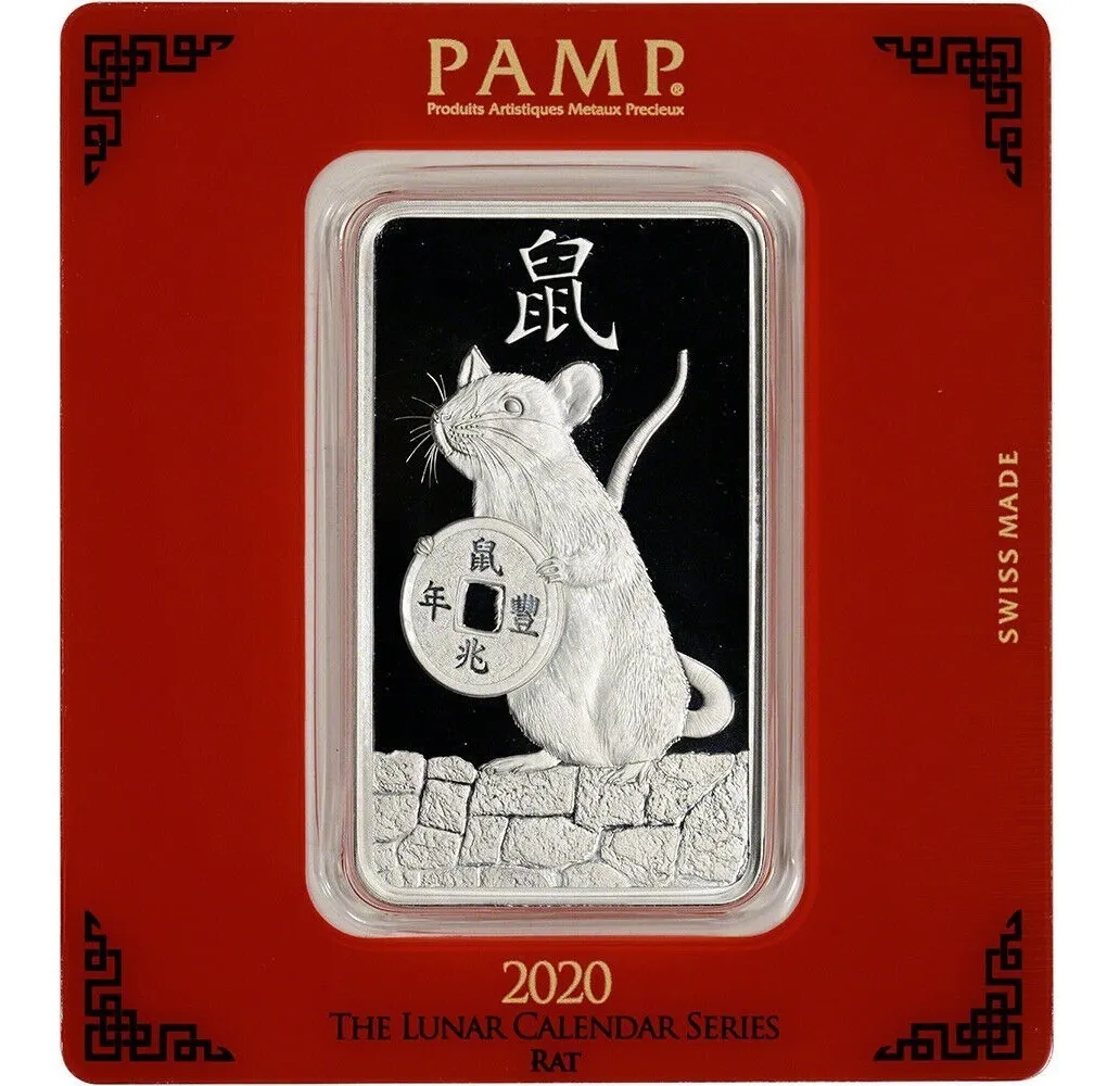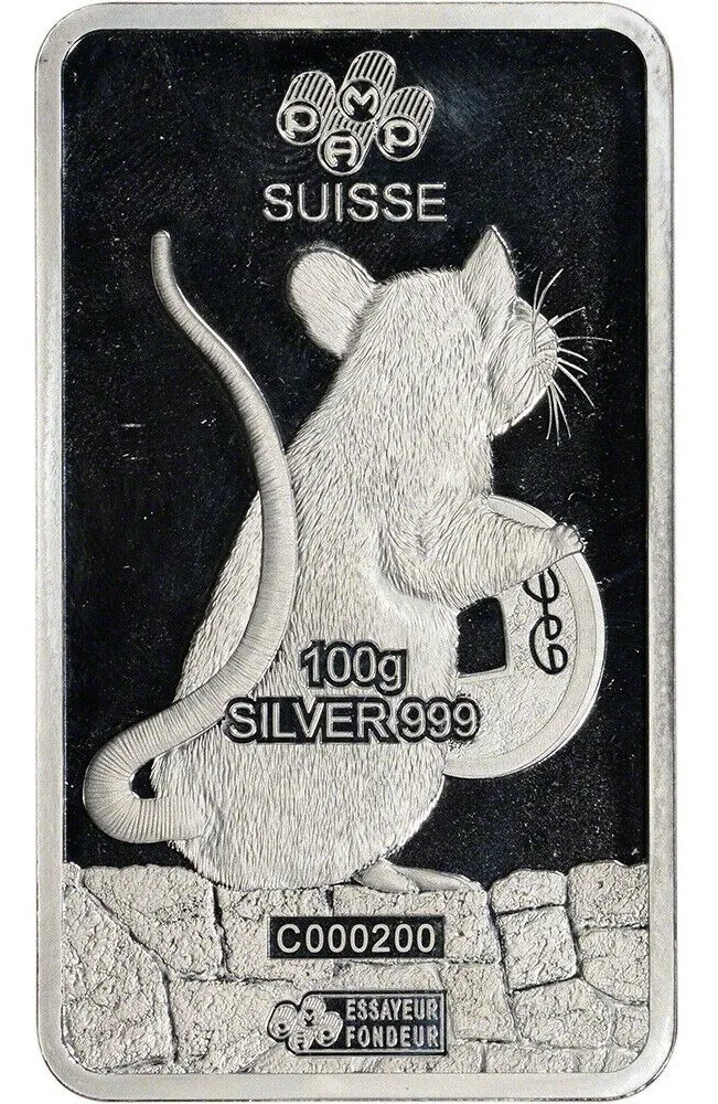 lingote PAMP Suisse de 100 gramos plata 24 k. 0,999 con motivo LA RATA. Perfecto para completar o sumar pequeñas fracciones de plata de alta confianza. emitida por una de las mejores refinerÃas del mundo PAMP SUISA directa de allÃ, en blÃster sellado y numerado uno por una que confiere una certificación única directa con seguro de autenticidad en su blÃster además como complemento se entrega la historia de dicha refinerÃa como aval adicional de quien la fabrico, de esta forma asegura su pureza para que no la falsifiquen hay copias falsas a menor precios, no perdérsela y asegurar su futuro y coleccione los distintos animales conmemorativos de los signos del zodiaco chino, hay también de 10 gramos 1 onza /31,12 gramos-y de 100 gramos de diferentes animales del año chino en plata u oro 24 k. 0,999 refinerÃa suiza pamp