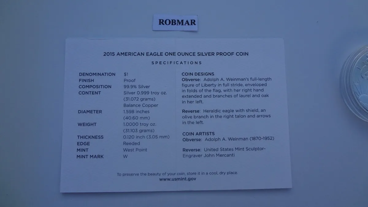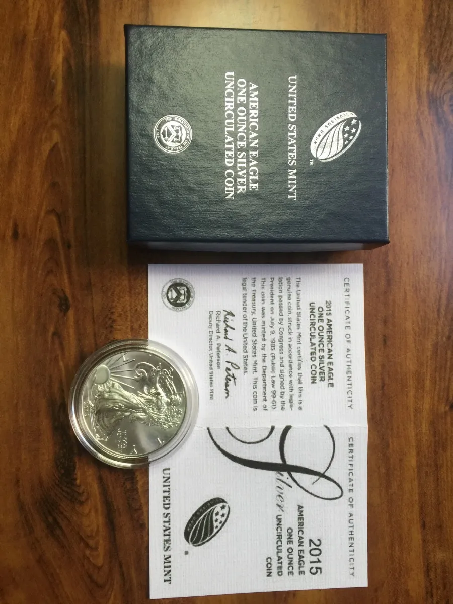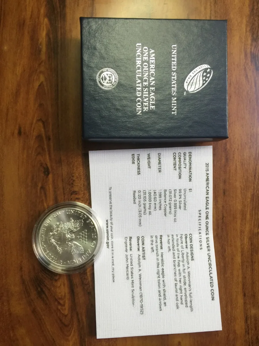 Robmar-USA_moneda de 1 onza de plata 24k.del Eagle del año 2015 con estuche directo de la casa de moneda de USA