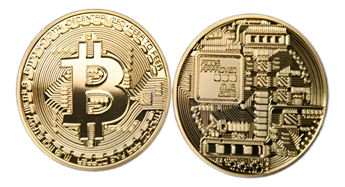 Moneda física Bitcoin 2021 bañada en oro 24k. 0,999, souvenir coleccionable. en capsula protectora mas descripcion y bolsita para guardarla segura, Perfecta para fans de criptomonedas y coleccionistas tech que desean una pieza simbólica. hay también bañados en plata y otras criptomonedas publicadas