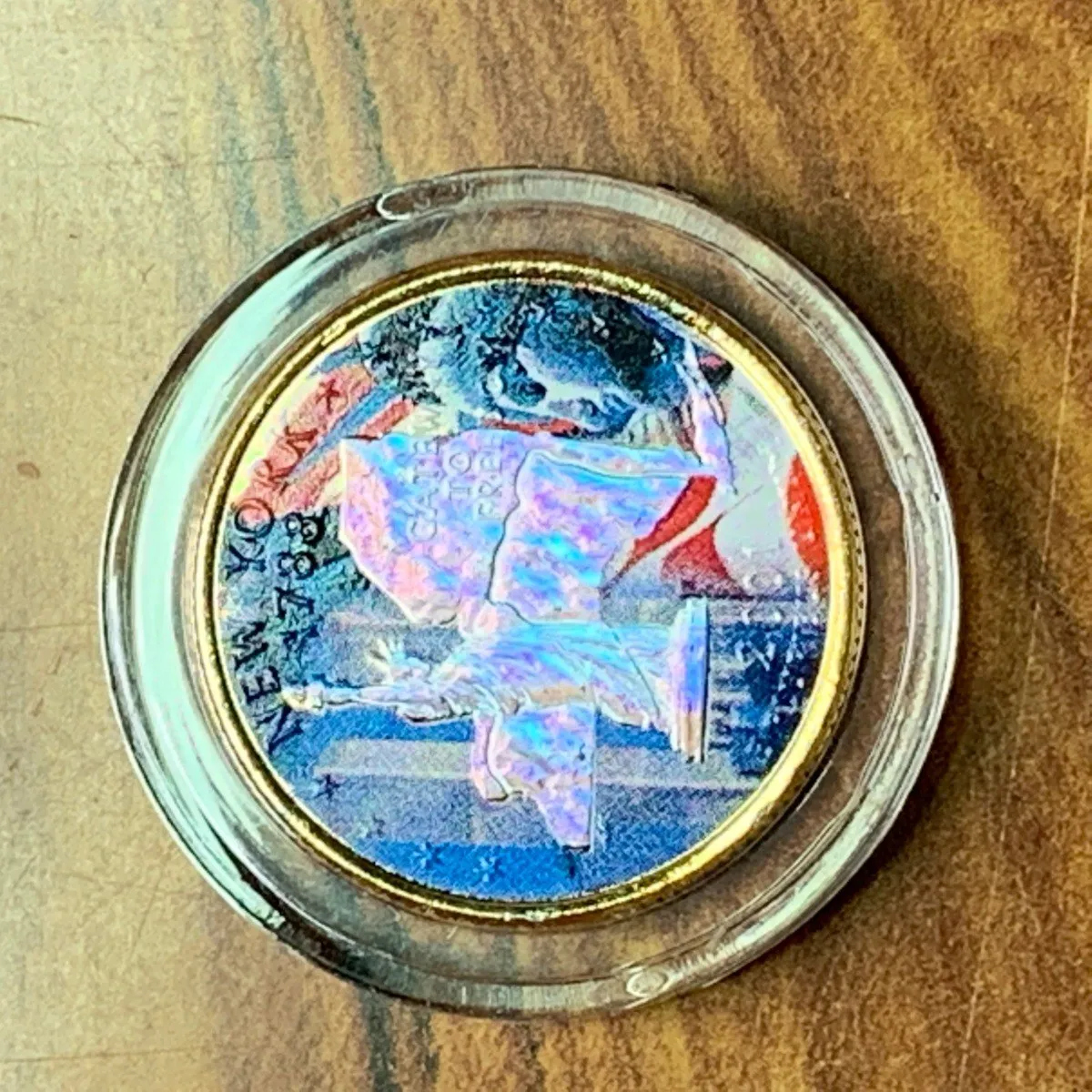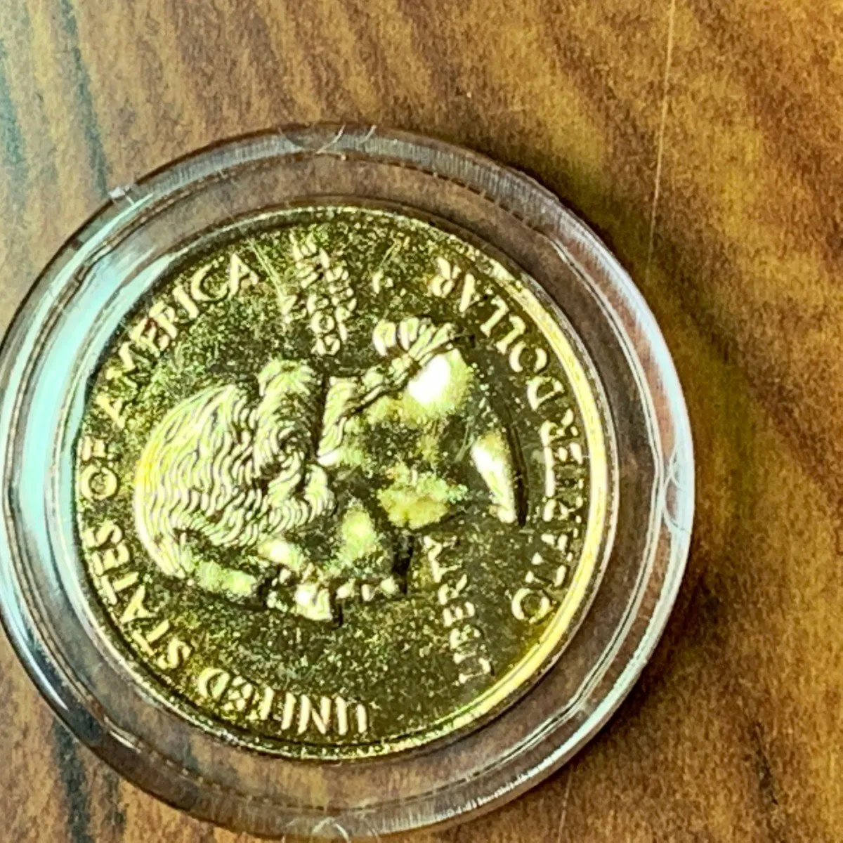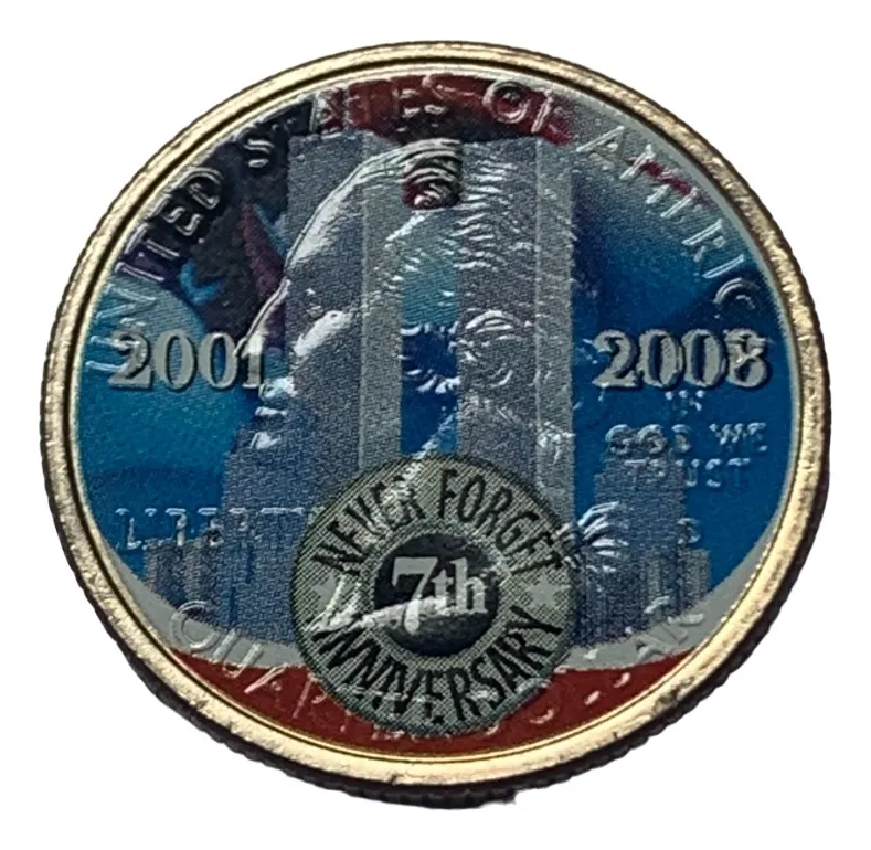 Quarter USA 2001 con Estatua de la Libertad en color. Pieza vistosa para colecciones patrióticas y turÃsticas. tiene una cara pintada conmemorando la esfinge de la estatua de la libertad en moneda real de 25 cents