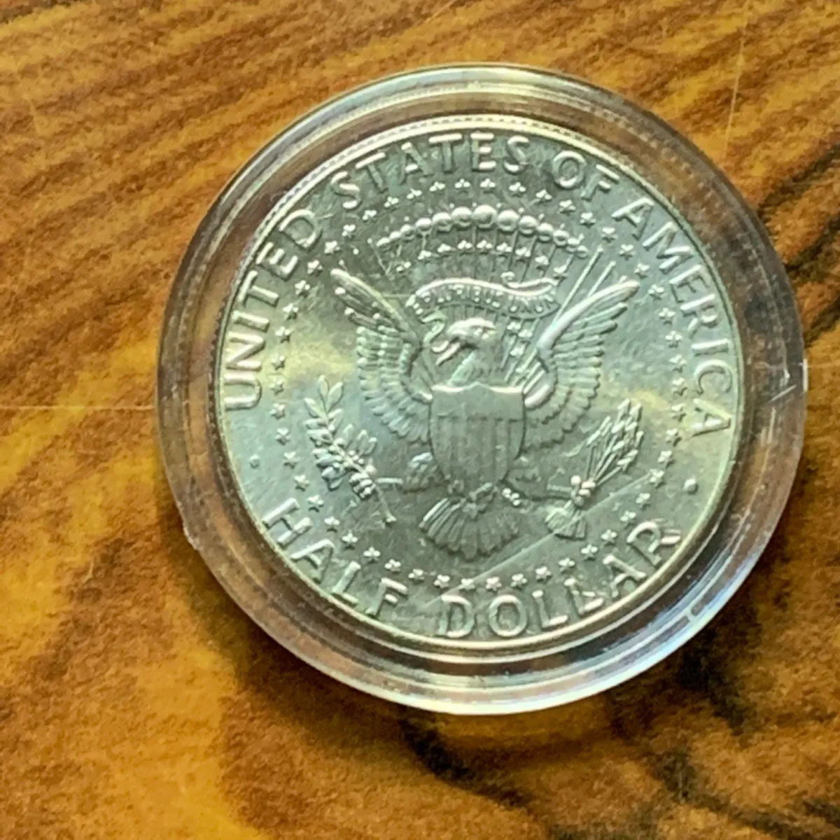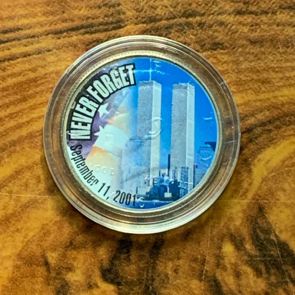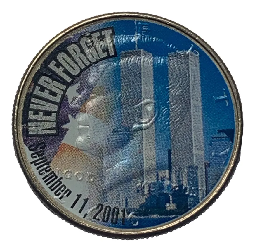 Medio dólar USA 2001 con diseño de las Torres Gemelas en color. Pieza conmemorativa y emotiva para colecciones patrióticas. omenajeando la caida de las torres, pintada en laca en color en moneda real de 50 centavos de dolar