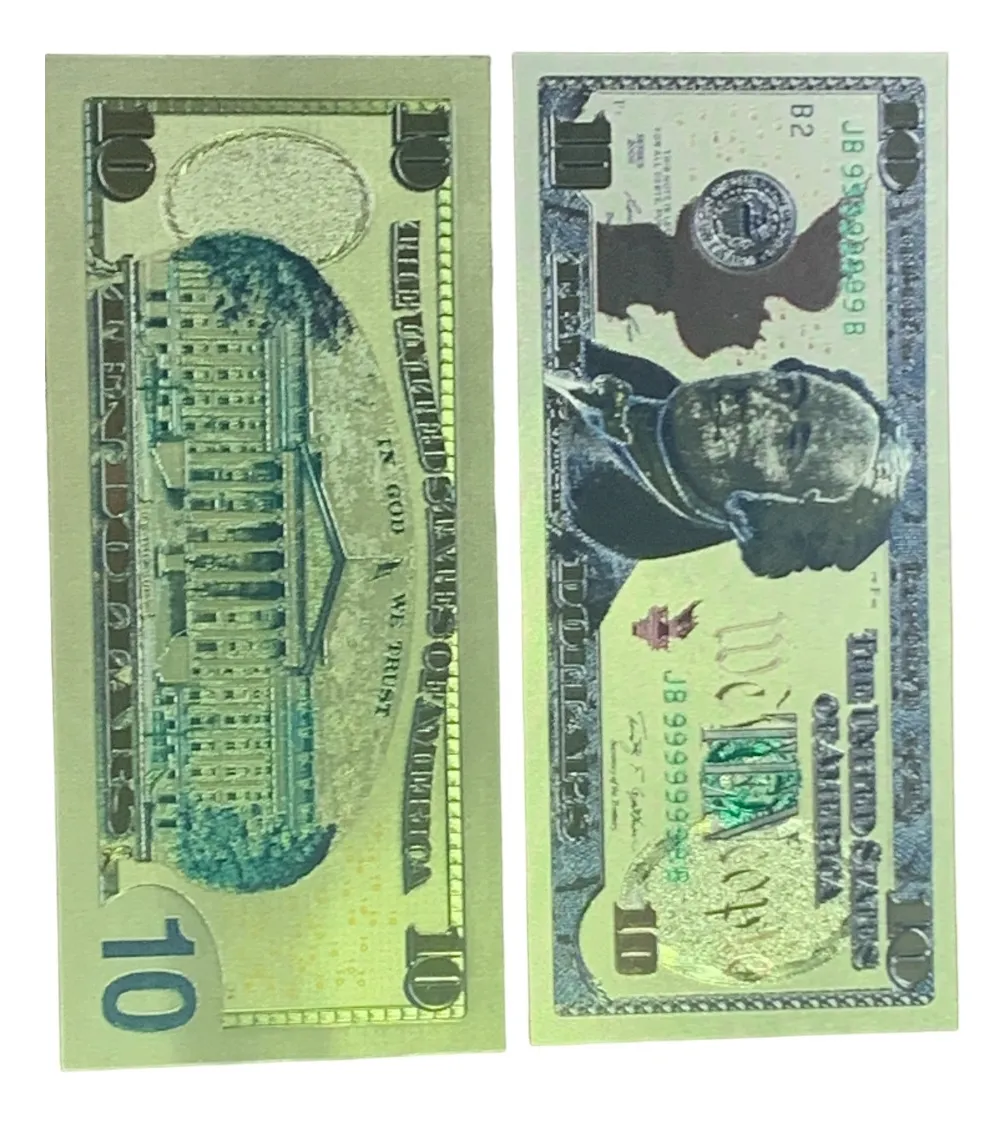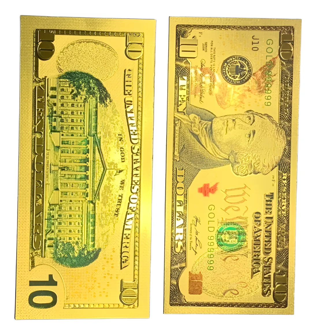 Billete conmemorativo de 10 dólares, plástico dorado en 24K, presentado como objeto decorativo y regalo original para amantes de la numismática contemporánea.