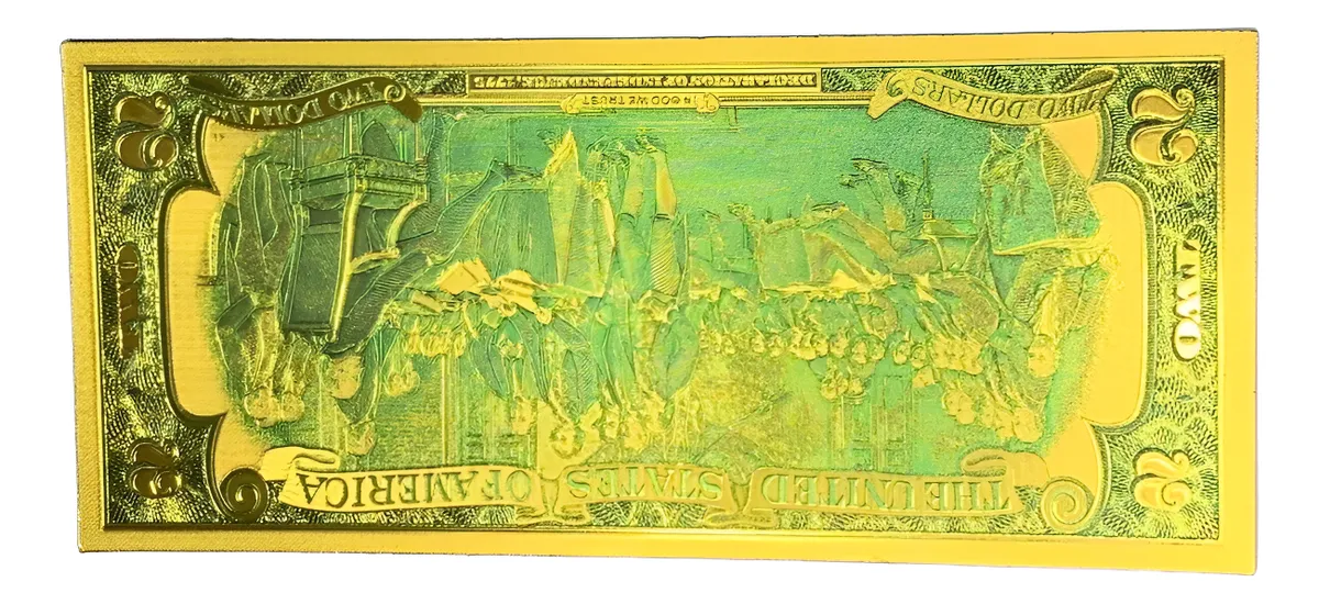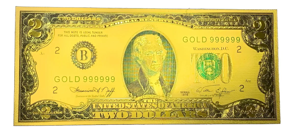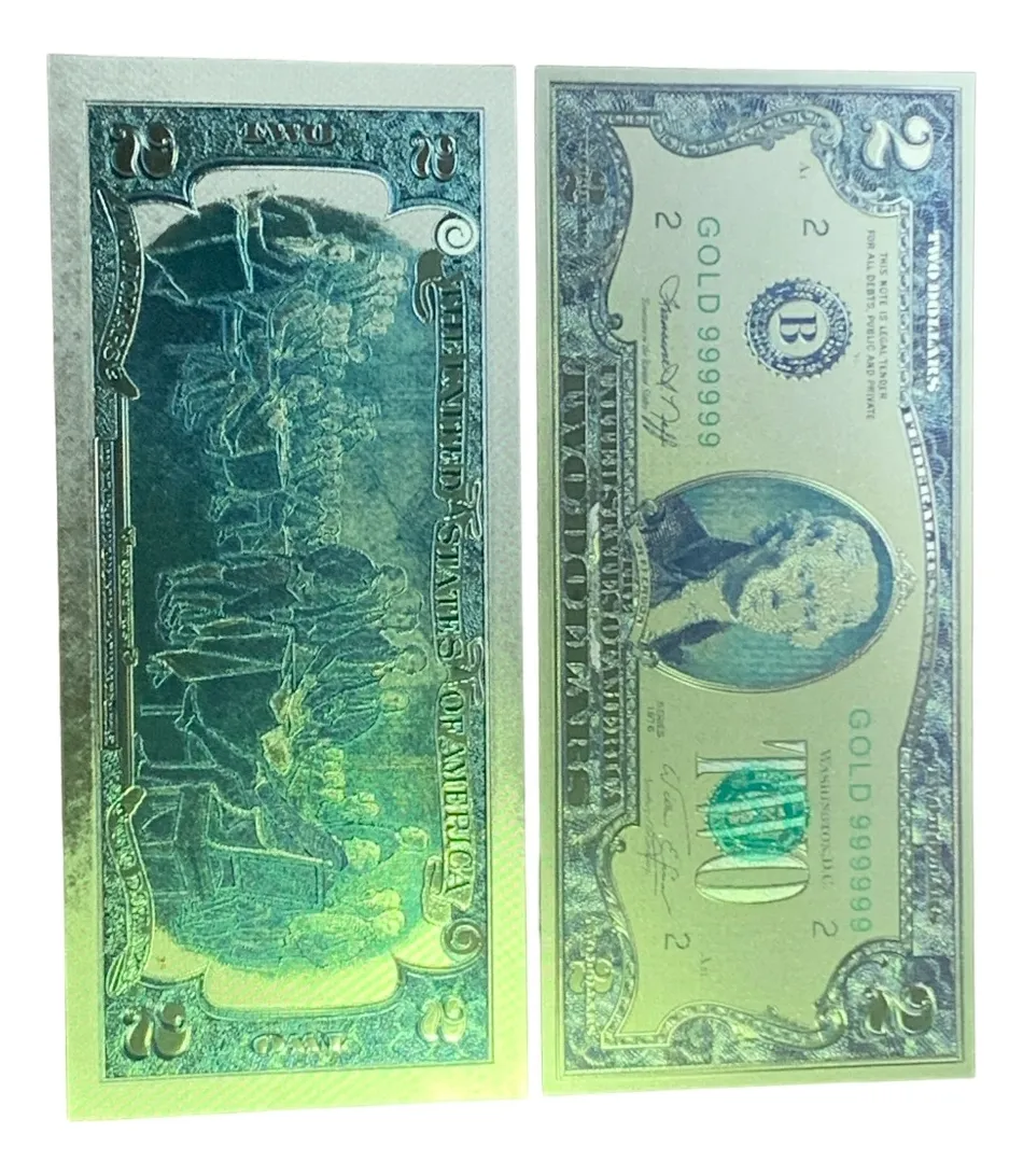 Billete conmemorativo estadounidense de 2 dólares, plástico con baño de oro 24K, presentado como oferta exclusiva. Aprovecha la ocasión para sumar una pieza moderna y brillante, perfecta para atraer miradas a cualquier colección personal.