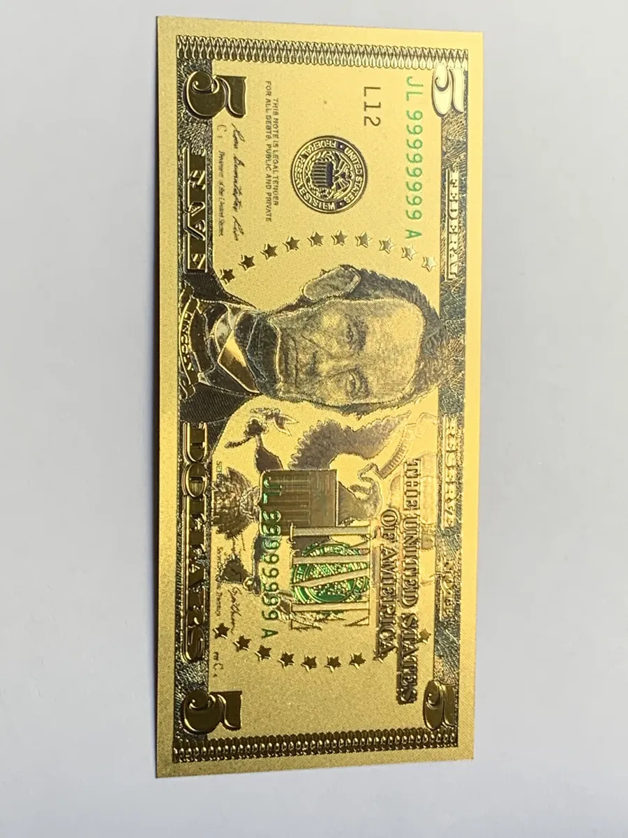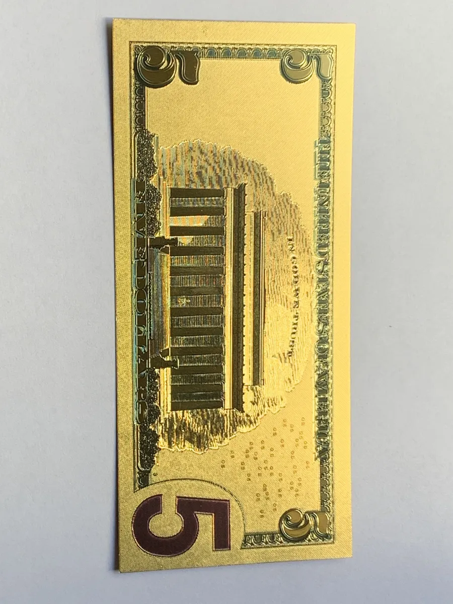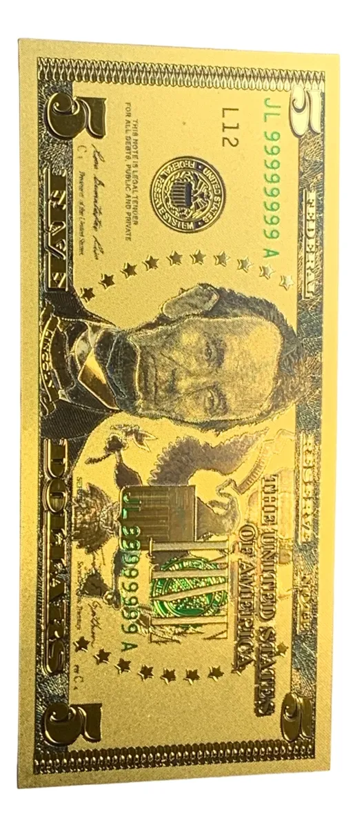 Billete decorativo de 5 dólares de EE.UU., plástico dorado con detalle en oro 24K, pieza novedosa que conserva la esencia de la moneda estadounidense con un toque de originalidad para quien busca algo diferente en su colección.