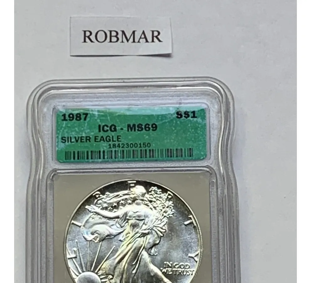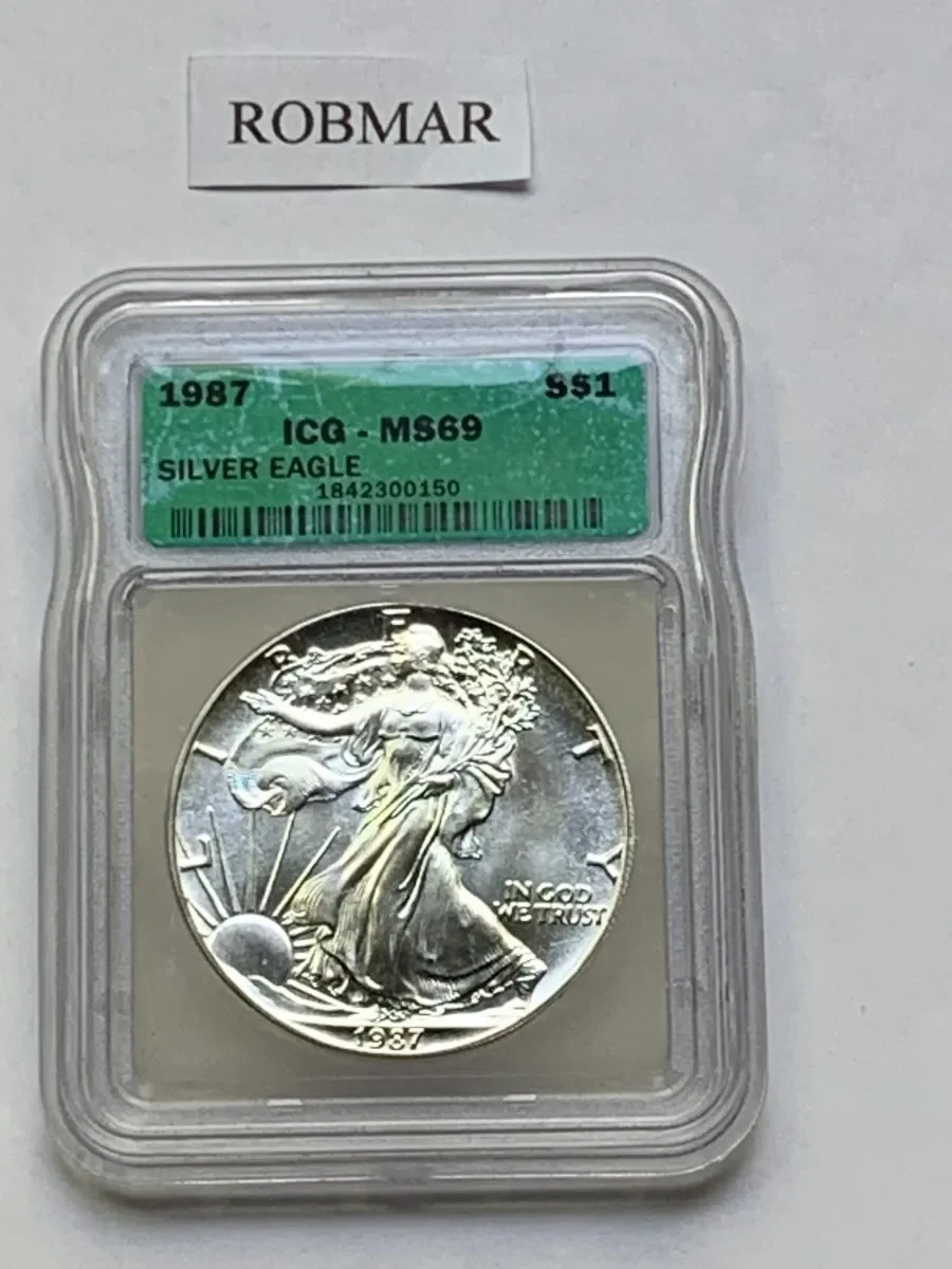 Moneda USA 1 onza plata 24k 1987 segunda emisión, encapsulada y con certificación oficial. Pieza clásica para colecciones serias y de largo plazo.