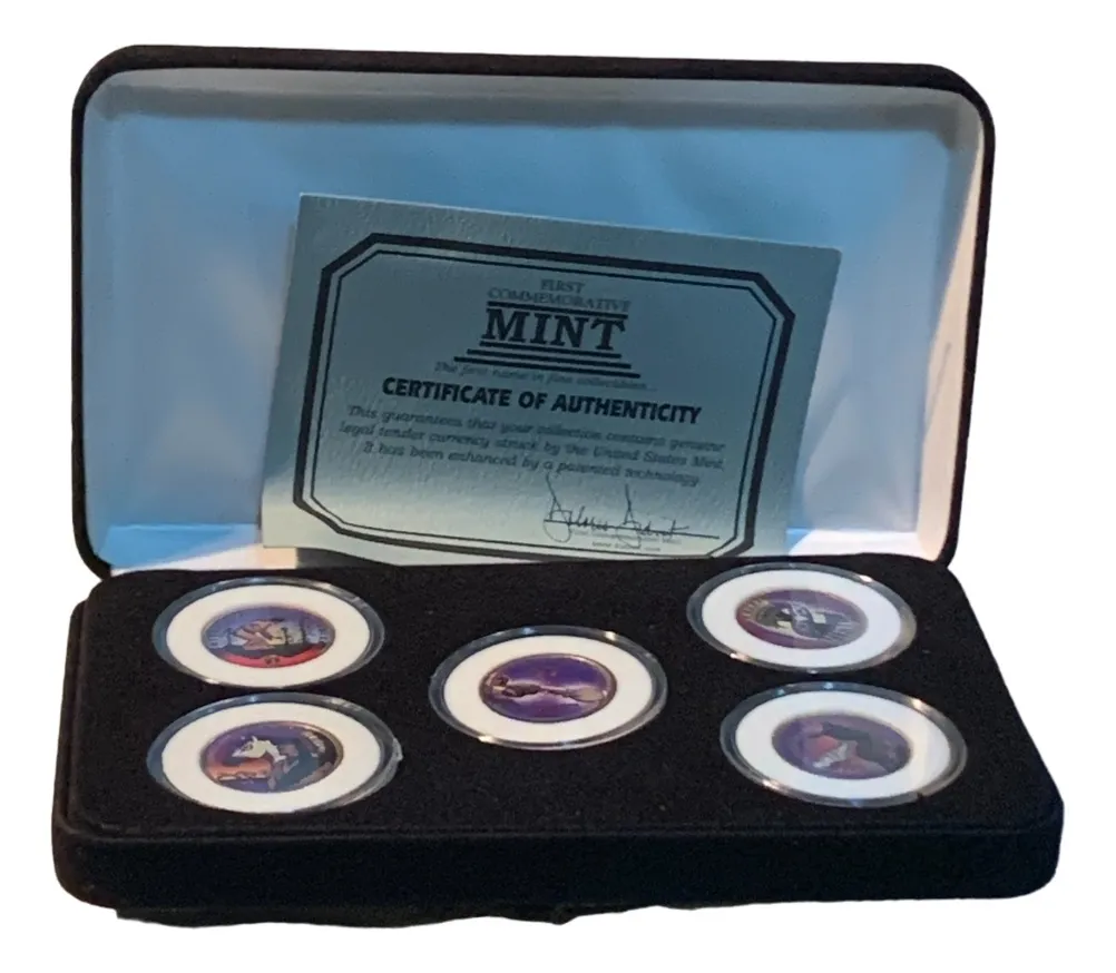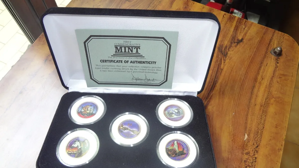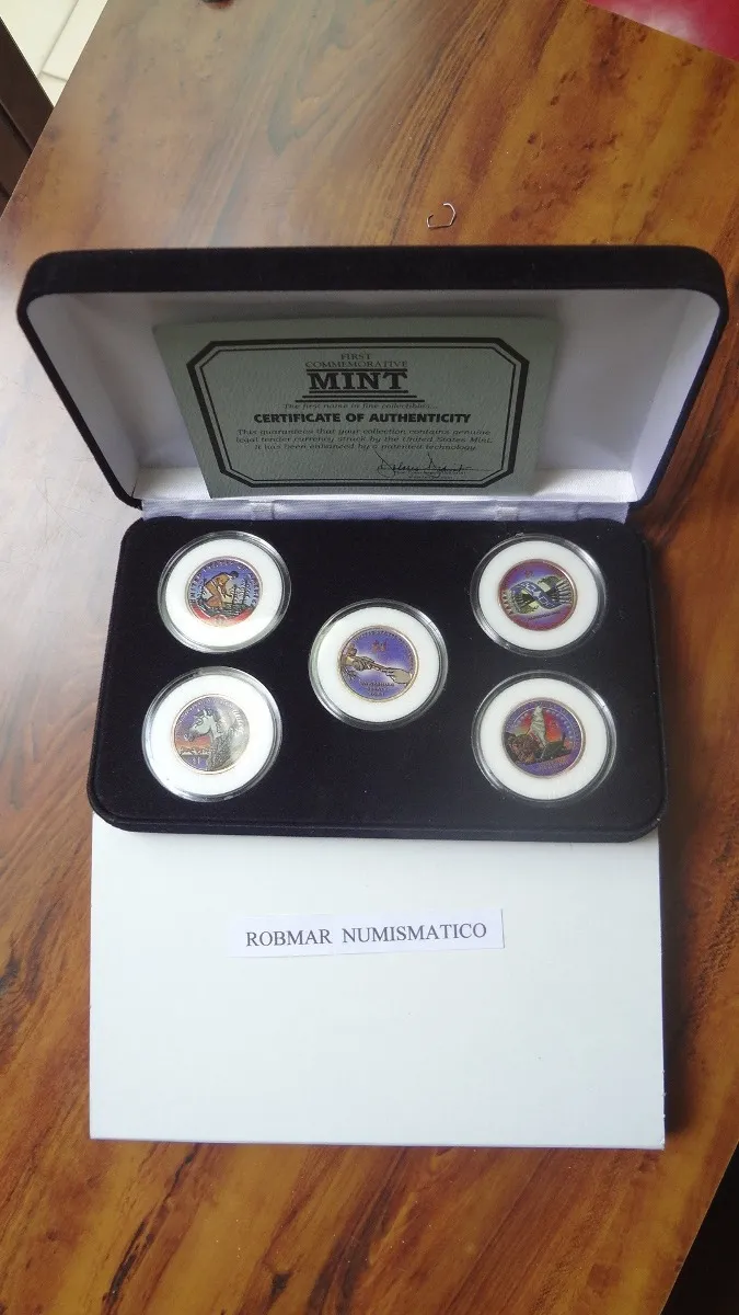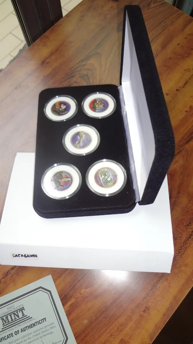 Estuche con 5 monedas de 1 dólar Sacagawea “La India”, con cara pintada/coloreada. Set llamativo para colecciones temáticas y souvenirs modernos. Lote de 5 dólares Sacagawea USA, fechas surtidas. Ideal para iniciar serie Native American o sumar stock a tu colección.( el precio es por las 5 de 1 dolar,)mas su estuche todas protegidas con capsula plástica y sin circular hay varios años en el lote, salen una vez por año conmemorando a esta india y su historia, y en el dorso se van colocando diferentes motivos indios americano y sus leyendas o situaciones de la historia de ellos, tenemos distintos motivos y años diferentes para armar su colección de esta moneda simbólica de estados unidos