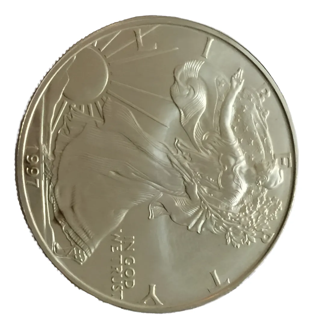 American Silver Eagle 1 oz 0,999 plata año 1997, con cápsula protectora. Clásico bullion estadounidense, perfecto para inversión y numismática. una de las monedas considerada de mejor inversión del mundo por su valor de inversión y muy valorada como moneda numismática de colección, salió la primera en 1986 y sigue hasta la fecha emitiendo todos los años muchos millones por su demanda clásica de atesoramiento como inversión y numismáticamente en todo el mundo financiero, se valora mas que el dólar por ser de plata y mas por ser segura de comerciar en el mundo financiero, hay en la pagina y en mercado libre, muchas fechas y presentaciones diferentes, si le falta alguna fecha consulte y veremos en nuestro stock si la tenemos en existencia