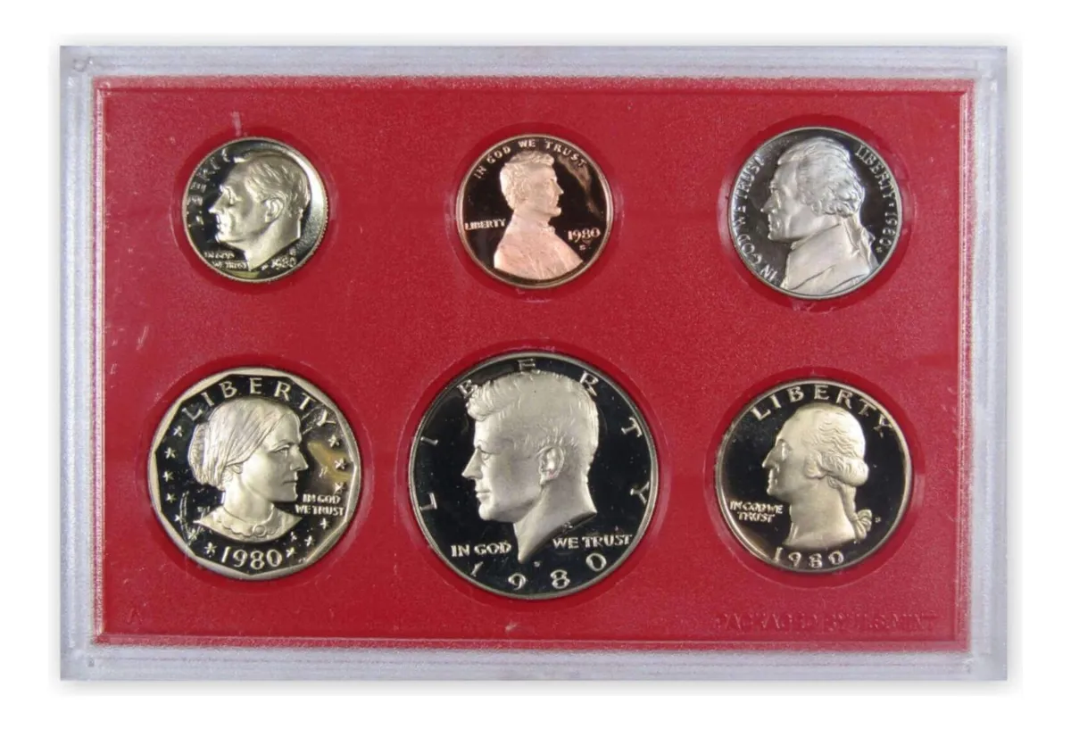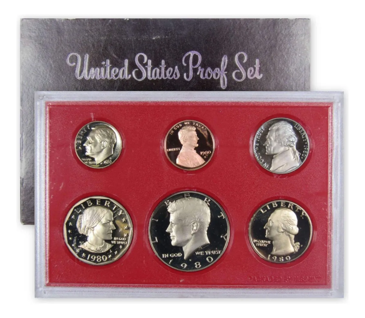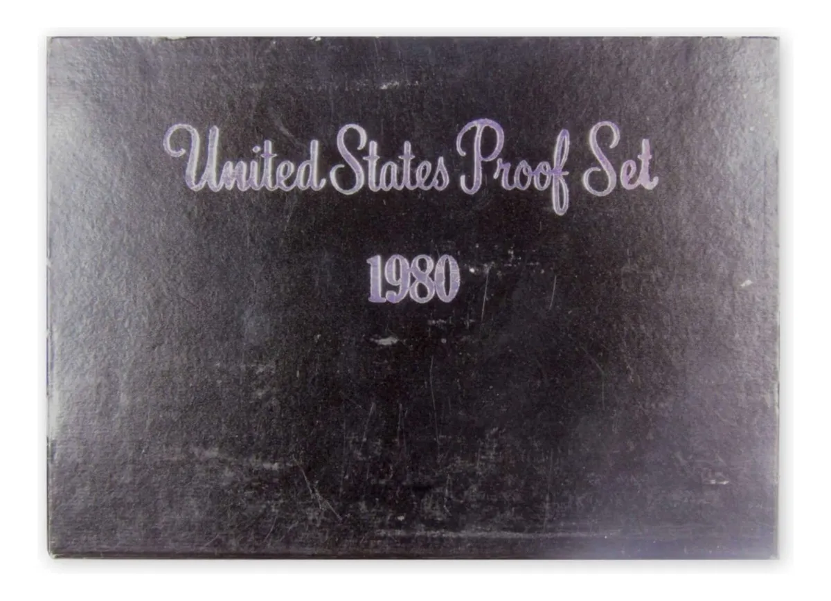 Set proof 1980, quinta emisión ceca S, encapsulado y en estuche. Pieza codiciada por coleccionistas experimentados y patrimonios numismáticos.