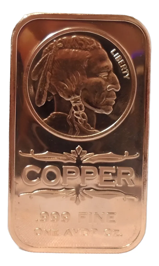 Lingote de 1 onza de cobre puro 0,999, motivo “cabaza de Indio nativo” americano,