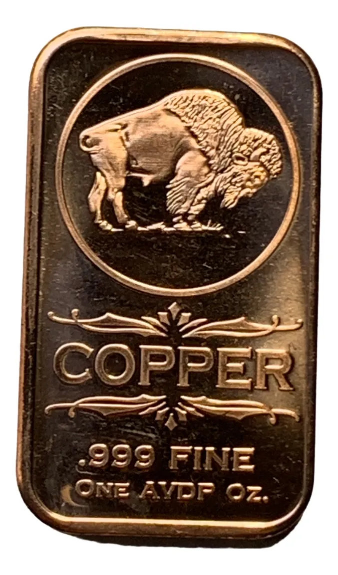 Lingote de 1 onza de cobre puro 0,999, diseño “Búfalo”, Pieza tipo bullion decorativo ideal para coleccionistas de temática americana.con capsula protejiendolo.-el cobre es un metal con mucha demanda y aumenta en dolares es ideal como inversion de metal precioso mejor que el dolar, asi protejera y afirmara su futuro, hay publicados 10 motivos diferentes y otrostamaños de 5 onsas,de 8 onsas y 16 onsas tambien hay en el sitio en forma redondas llamadas rondas de 1 onsa con 120 motivos diferentes de animales, armas, copias de monedas representativas y otras variantes le dimos a cada ronda un numero del 501 al 620 para que ademas de invertir seria un forma de coleccionar los distintos motivos que les ofrecemos, de esta manera sera una inversion de uno de los metales prociosos de gran demanda que como sube internacionalmente en dolar tiene una doble inversion para asegurar su dinero futuro, consulte los variados motivos