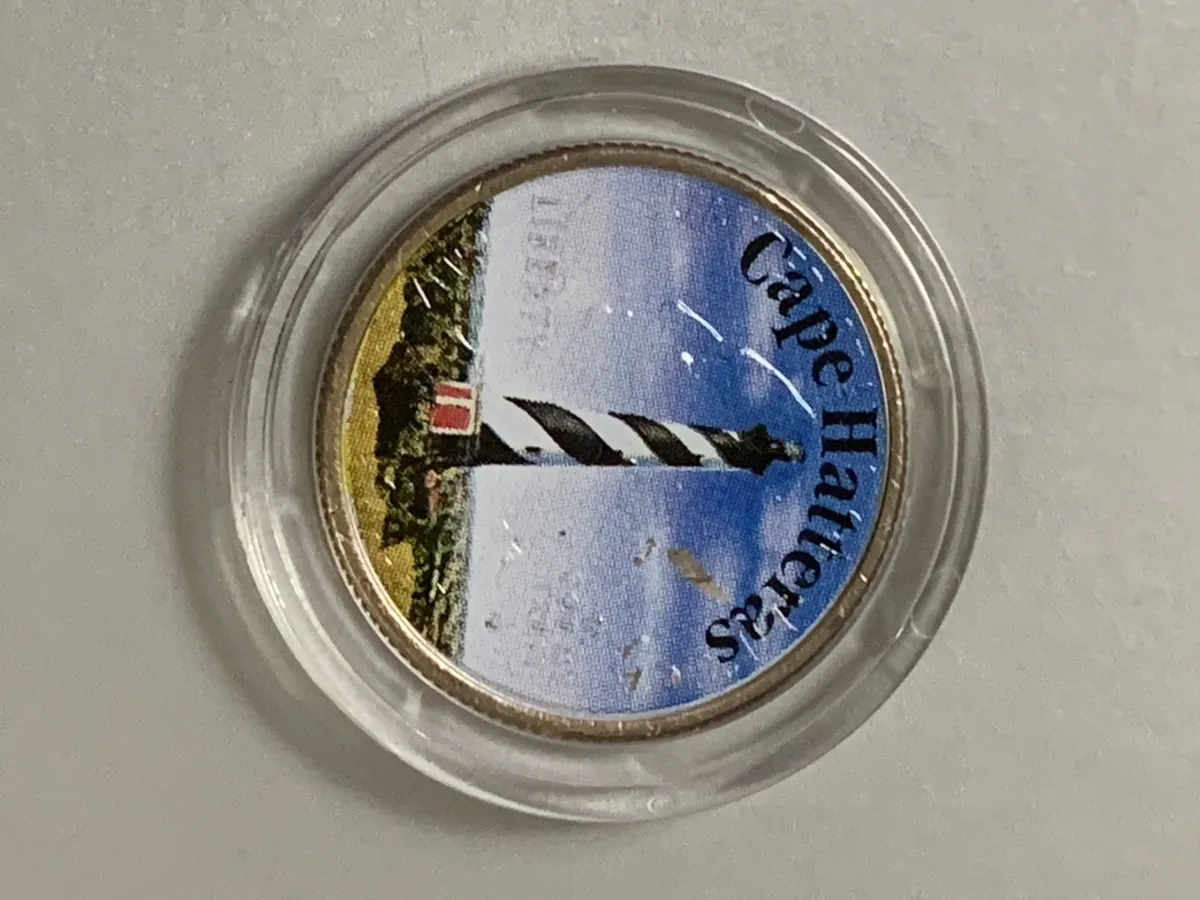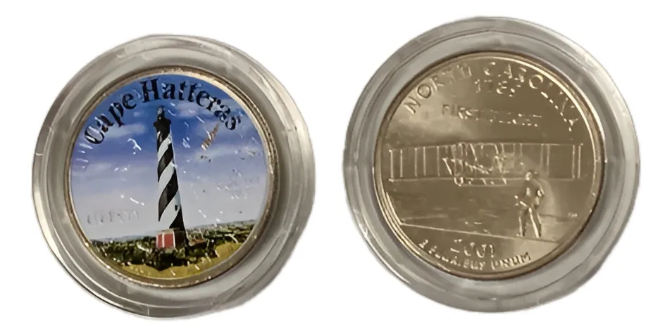 Moneda número 19 usada de Carolina del Norte, representando el Faro de Cape Hatteras. Su uso aporta valor histórico y visual a colecciones numismáticas especializadas.