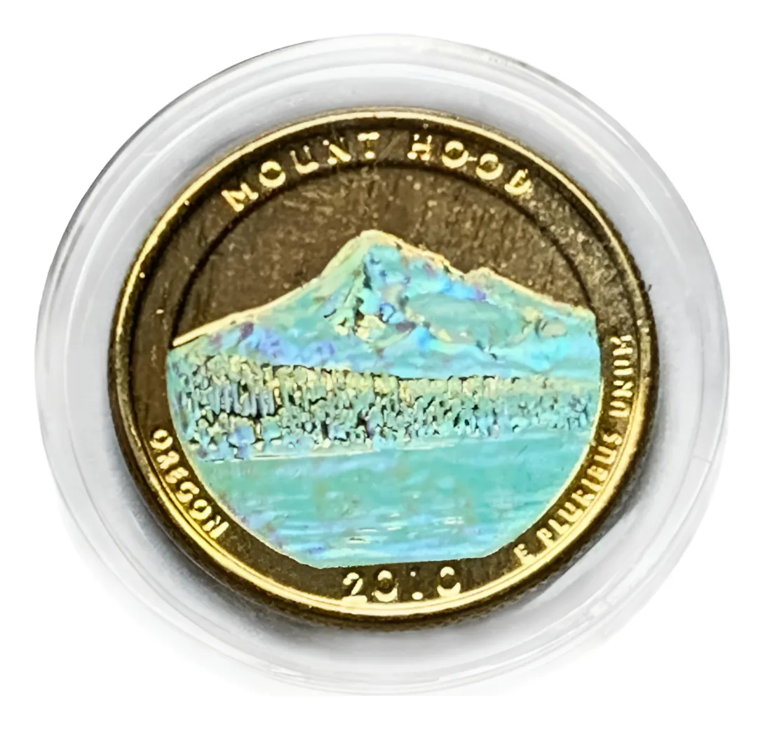 Quarter 2010 USA, diseño Mount Hood, baño oro 24k y acabado óleo. Edición con alta definición y brillo, óptima para regalar y coleccionar.