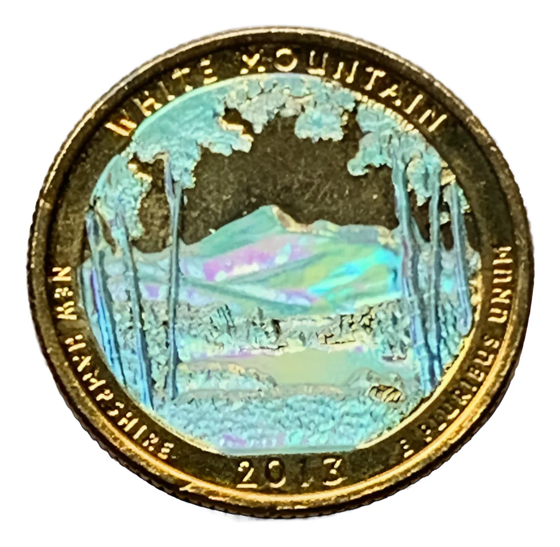 Moneda quarter White Mountain 2013, bañada en oro y óleo, diseño intensificado para colecciones de parques nacionales de alta gama.