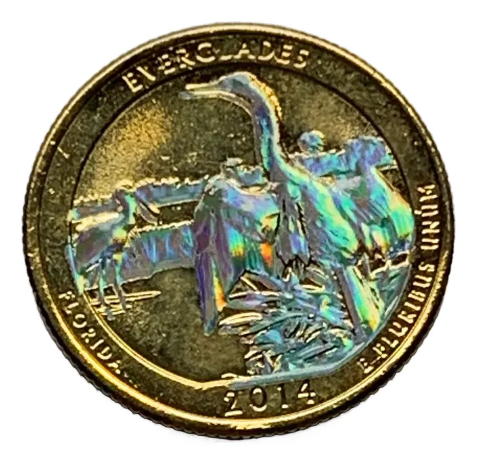 Moneda quarter 2014 bañada en oro 24k y con acabado óleo, diseño Everglades. Pieza única para coleccionistas, con colores vivos y brillantez máxima.