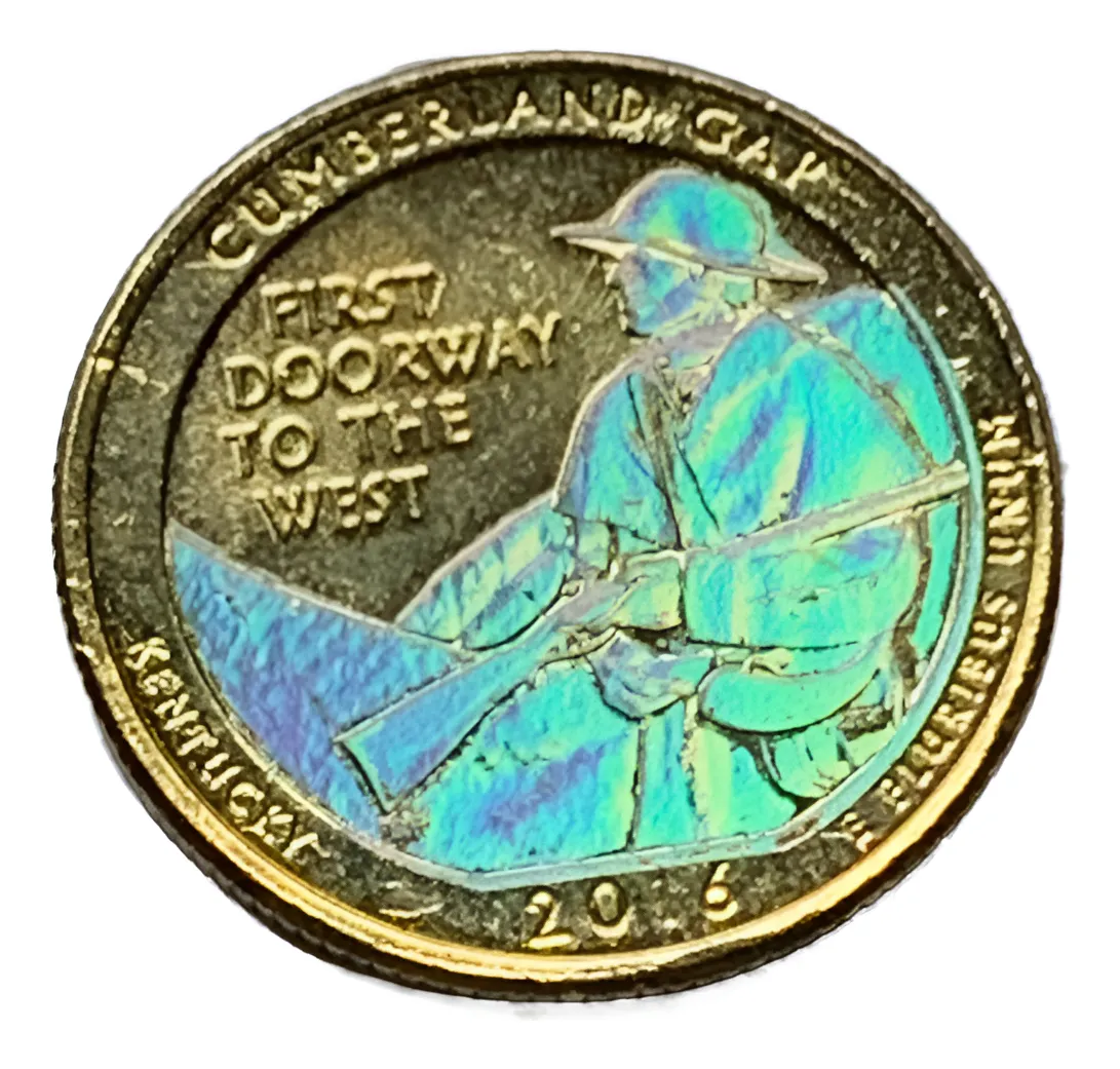 Moneda 2016 en serie quarter USA, baño oro 24k y acabado óleo, diseño Cumberland Gap. Pieza artística y coleccionable, con elevado detalle y valor.