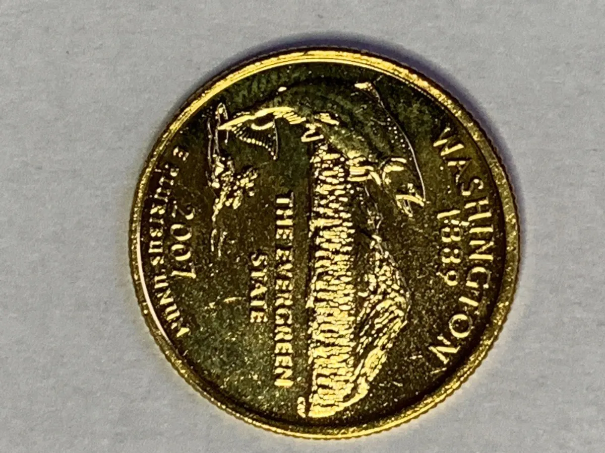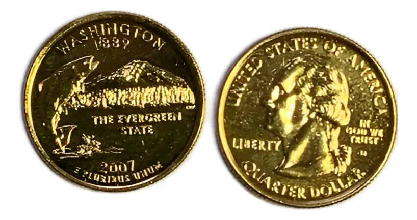 Quarter estadounidense de Washington de 2007, recubierto en oro 24K. Esta moneda usada exhibe el majestuoso salmón y el monte Rainier, fusionando naturaleza y tradición