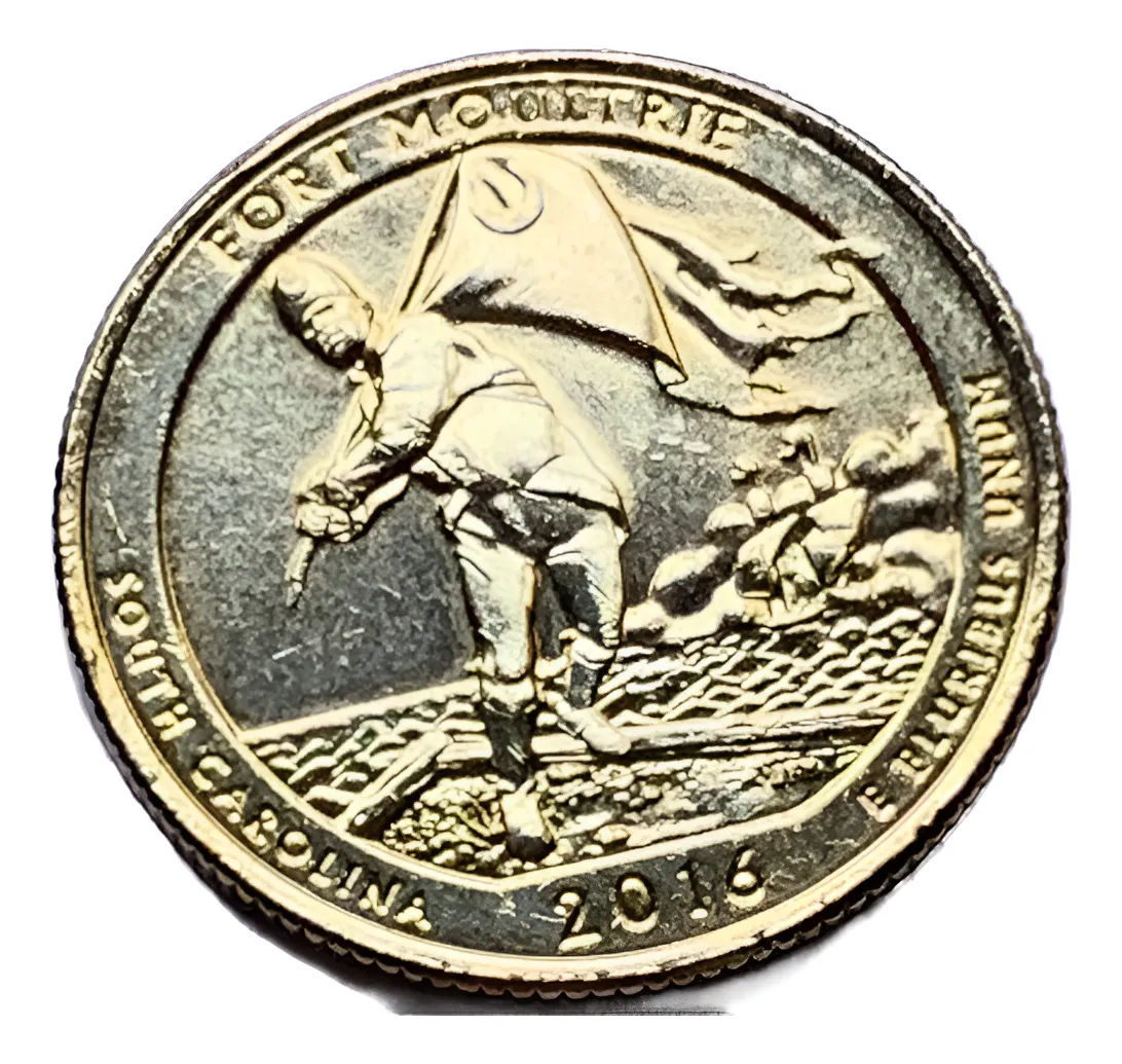 Quarter USA 2016, número 35, Fort Moultrie, acabado en oro 24k. Perfecta para colecciones temáticas de parques nacionales con acabado brillante y protección cápsula.