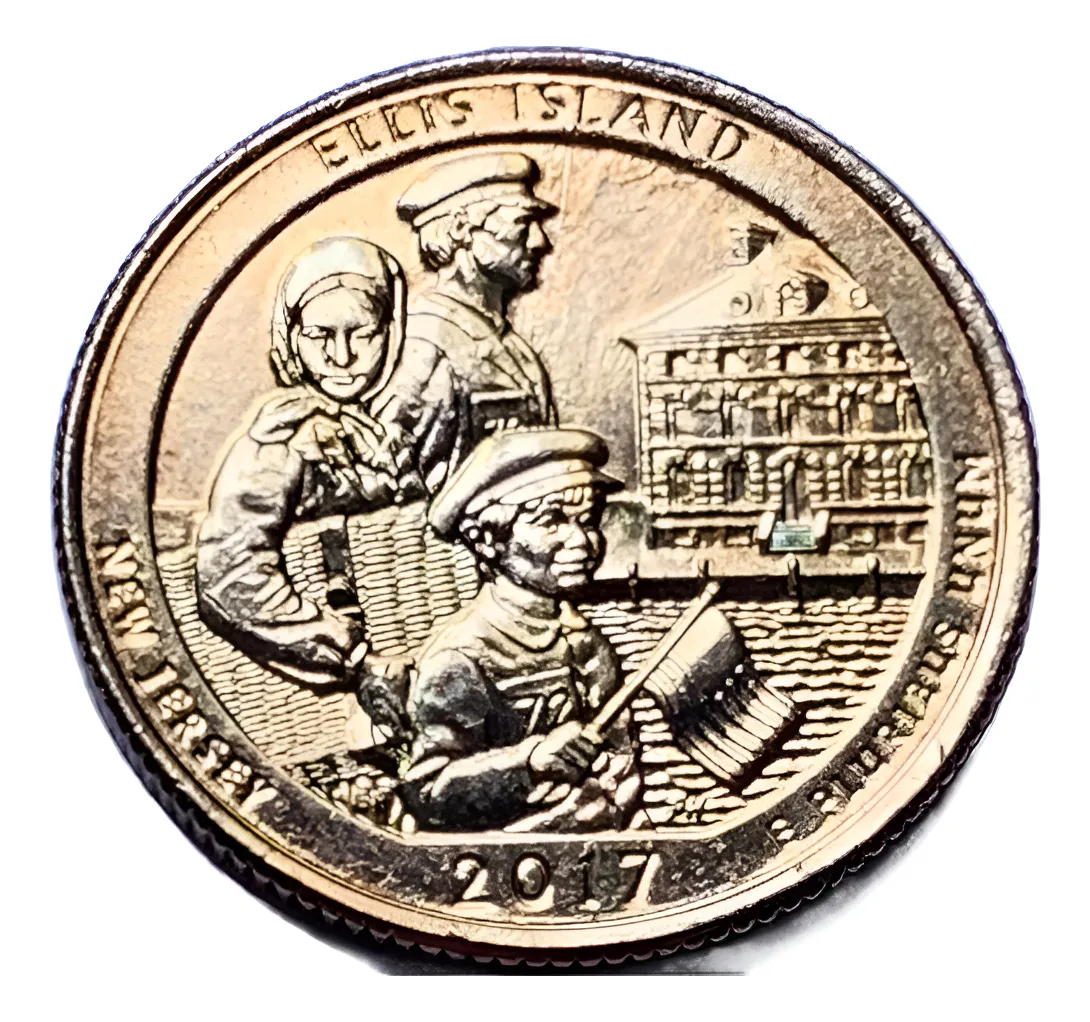 Quarter Ellis Island 2017 N°39, oro 24k. Familia de inmigrantes ante la isla, en versión emotiva.
