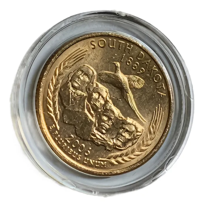 Moneda de USA quarter 2006 P- South Dakota pintado con baño de oro. Ideal para completar colección temática de estados con baño en oro. hay publicados cada uno de los componentes de la serie de los estados de la unión de usa. empiece o complete su colección de esta serie de 50 estados y también los 6 externos si este lo tiene no dude en preguntar el que le falte para completar esta hermosa colección que no se volverá a emitir jamás otra vez por lo tanto a medida que pase el tiempo serán más difÃciles y buscados por los numismáticos del mundo, consulte y si lo tenemos de lo brindaremos.-hay muchos en esta pagina que puede conseguir lo que le falte, ese es con baño de platino, los tenemos con baño de oro, también pintados en laca las figuras y bañados en oro y con oleografÃa encima, todos estas presentaciones únicos en argentina, además esta los comunes que salieron al público y tenemos desde 1900 hasta la actualidad conmemorativos desde el 1999 a la fecha que los emitieron 56 de los estados y 56 de los parques nacionales, si le falta alguno consulte si tenemos stock, son más baratos que los de tratamiento especial
