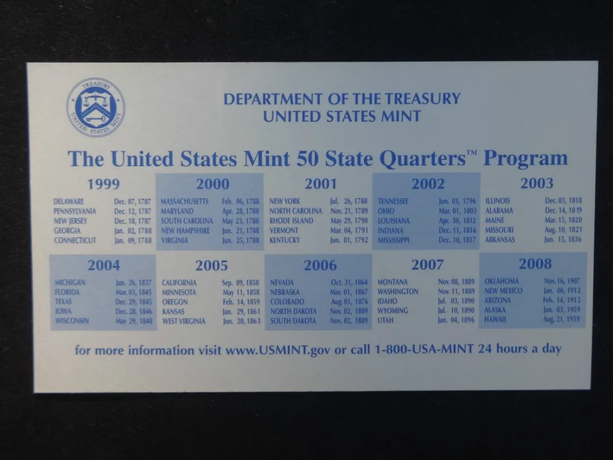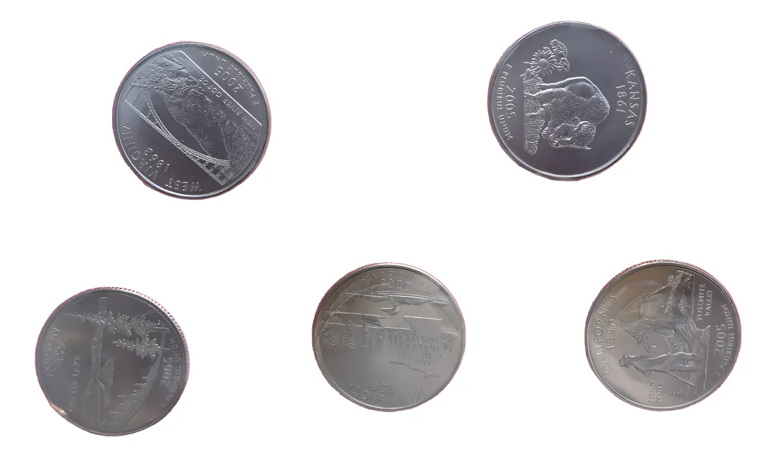 Set de 5 quarters USA 2005 ceca D con acabado satinado en sobre original. Presentación poco común, especial para coleccionistas avanzados de State Quarters. son de la serie de los estados desde 1999 al 2009,que nunca se van a emitir mas de esta serie por lo tanto a futuro cada vez será mas difícil conseguir dichos años y menos con esta presentación satinadas especialmente y selladas en plástico y sobre impreso directo de la casa dela moneda de usa. sin circular, por lo tanto tendrán con el tiempo mas valor por su presentación y demanda cada vez mas grande y difícil de conseguir, hay en esta pagina y en mercado libre, mas años de esta serie y presentación especial, consulte por stock disponible