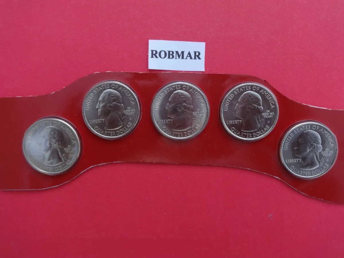 Set de 5 quarters ceca D año 2010 con acabado satinado. Serie atractiva para coleccionistas de ediciones especiales no circuladas.son de la serie de los estados desde 1999 al 2009,que nunca se van a emitir mas de esta serie por lo tanto a futuro cada vez será mas difícil conseguir dichos años y menos con esta presentación satinadas especialmente y selladas en plástico y sobre impreso directo de la casa dela moneda de usa. sin circular, por lo tanto tendrán con el tiempo mas valor por su presentación y demanda cada vez mas grande y difícil de conseguir, hay en esta pagina y en mercado libre, mas años de esta serie y presentación especial, consulte por stock disponible