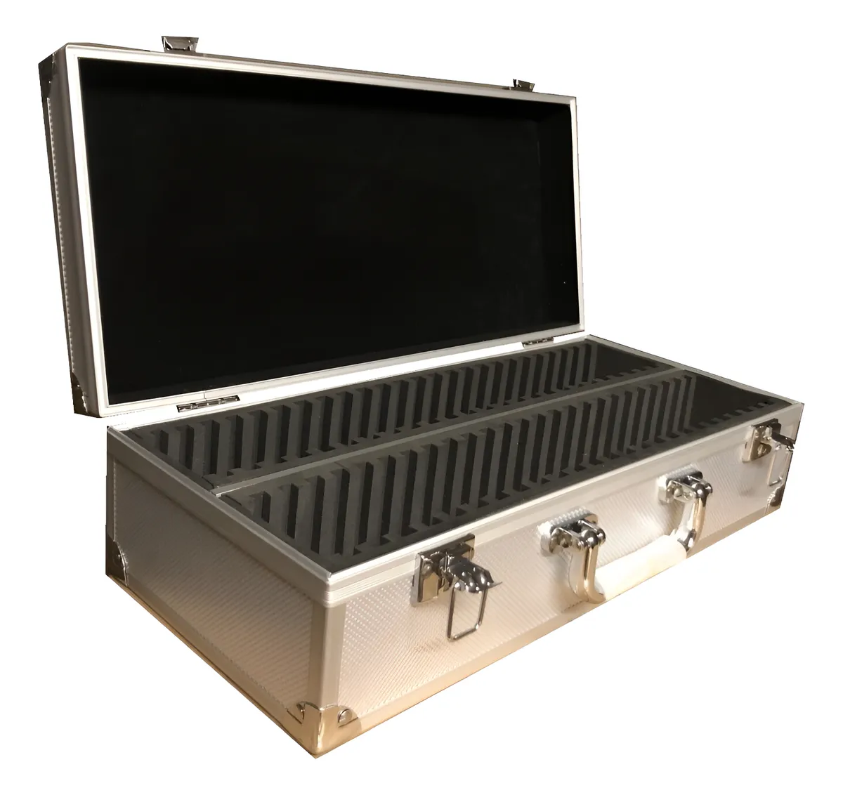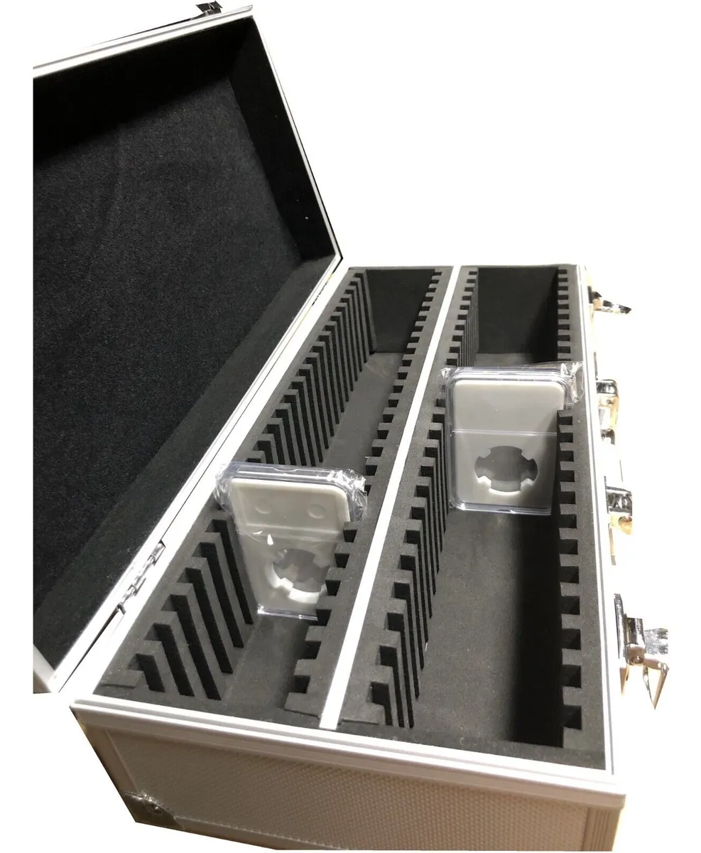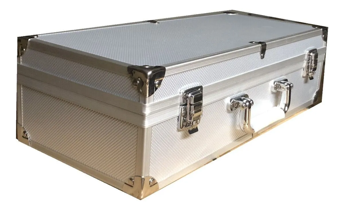 Valija metálica de aluminio N°9 vacía capacidad 50 blisters. Almacenamiento profesional y elegante.Perfecta para monedas medianas de coleccion.sus ranuras aceptan tambien lingotes o blister de 1 onza, con su contratapa acolchada para que ningun producto se mueva y cerradura con llave, ideal pata colecciones y tambien transportarlas con fines de venta numismaticos