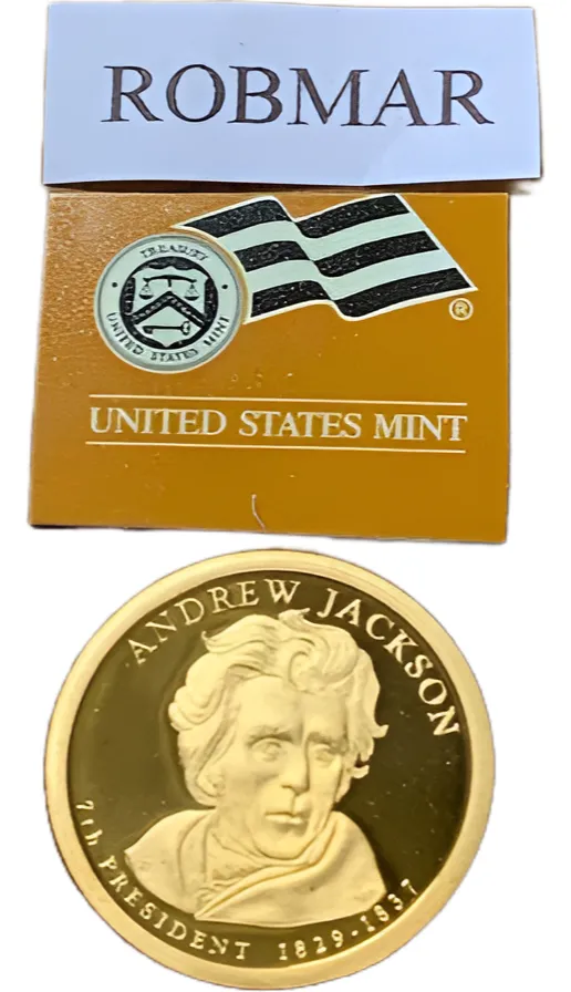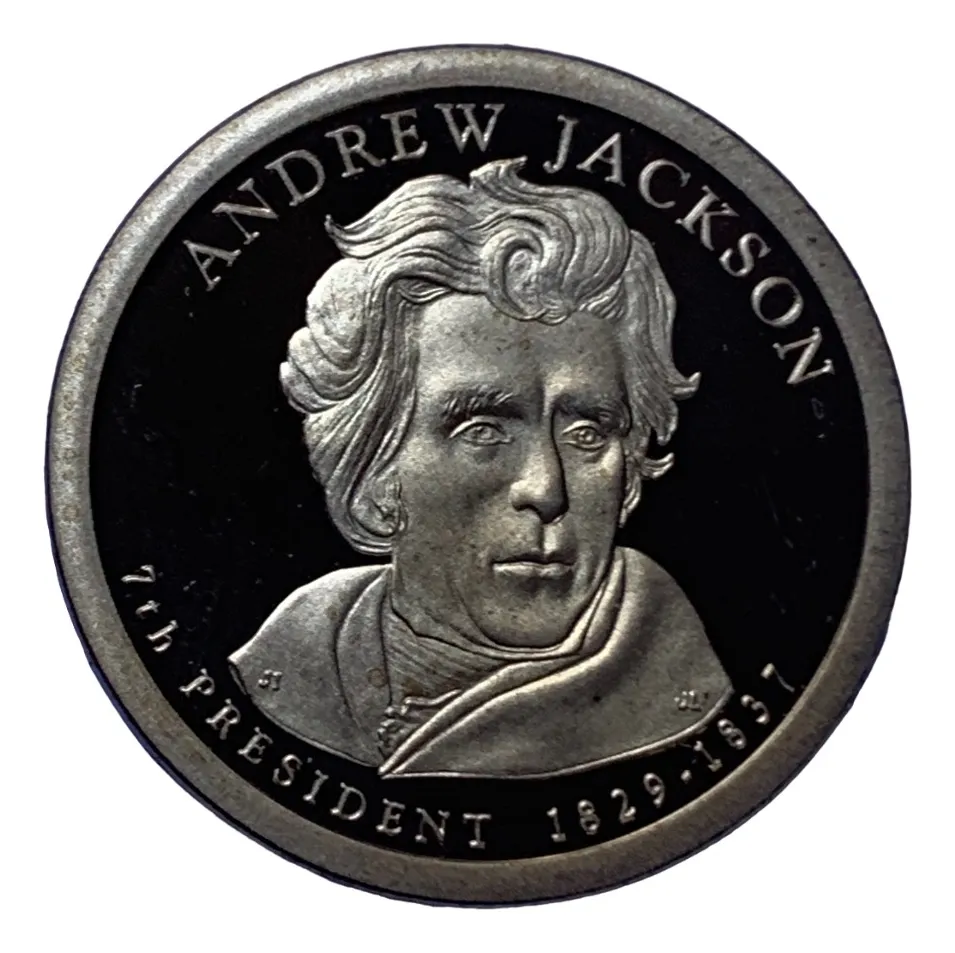 Dólar USA proof S, presidente Andrew Jackson, serie 2008. Pieza numismática con pureza certificada, ideal para sumarse a colecciones profesionales.con capsula protectora y certificado